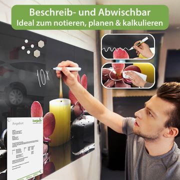 Auf der glatten Glasoberfläche lassen sich Termine, Rezepte oder Notizen ganz einfach mit Kreidestiften festhalten und rückstandslos entfernen. Starke Neodym-Magnete halten Ihre wichtigsten Erinnerungen sicher an Ort und Stelle. So entsteht Ihre ganz persönliche Ideenwand - jeden Tag neu.