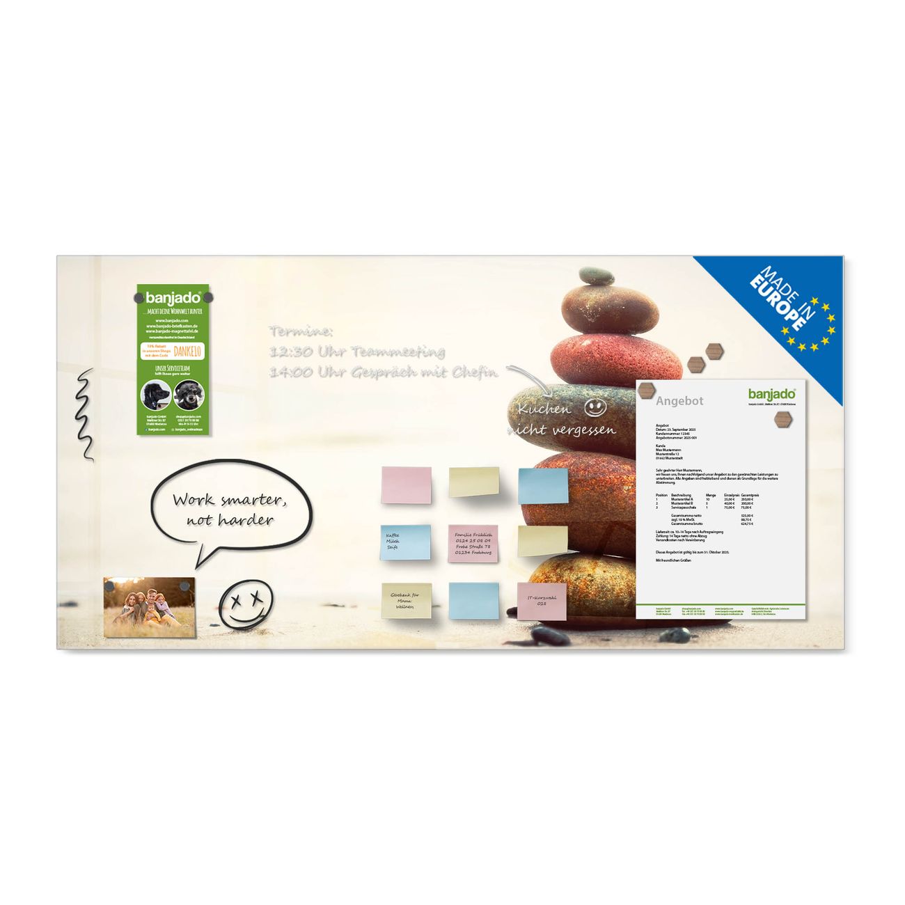 Die banjado Glas Magnettafel mit dem Motiv Motiv Steinmännchen verbindet Funktionalität mit Stil. Sie ersetzt das Zettelchaos durch klare Strukturen und bringt dabei eine warme, natürliche Atmosphäre in Ihr Zuhause. Ob im Büro, in der Küche oder im Eingangsbereich - dieses Design-Board zieht Blicke an und sorgt für Ordnung mit Charakter.