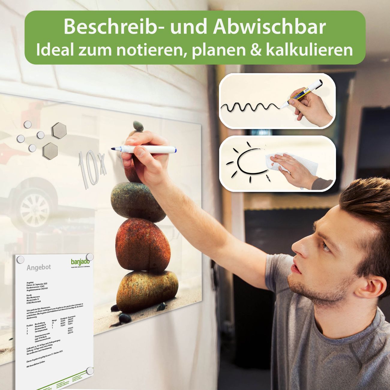 Bitte beachten Sie, dass ausschliessliche spezielle Magnete an der Glastafel haften. Wir empfehlen banjado Neodym Magnete, diese sind durch uns auf Wirksamkeit geprüft.