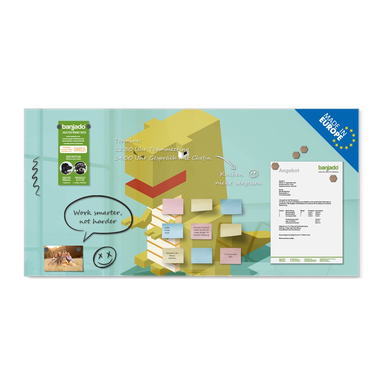 Jede Glas Magnettafel wird in unserer Werkstatt von Hand gefertigt und sorgfältig geprüft. So erhalten Sie ein echtes Qualitätsprodukt, das Funktion und Ästhetik perfekt vereint.?? Warum banjado?