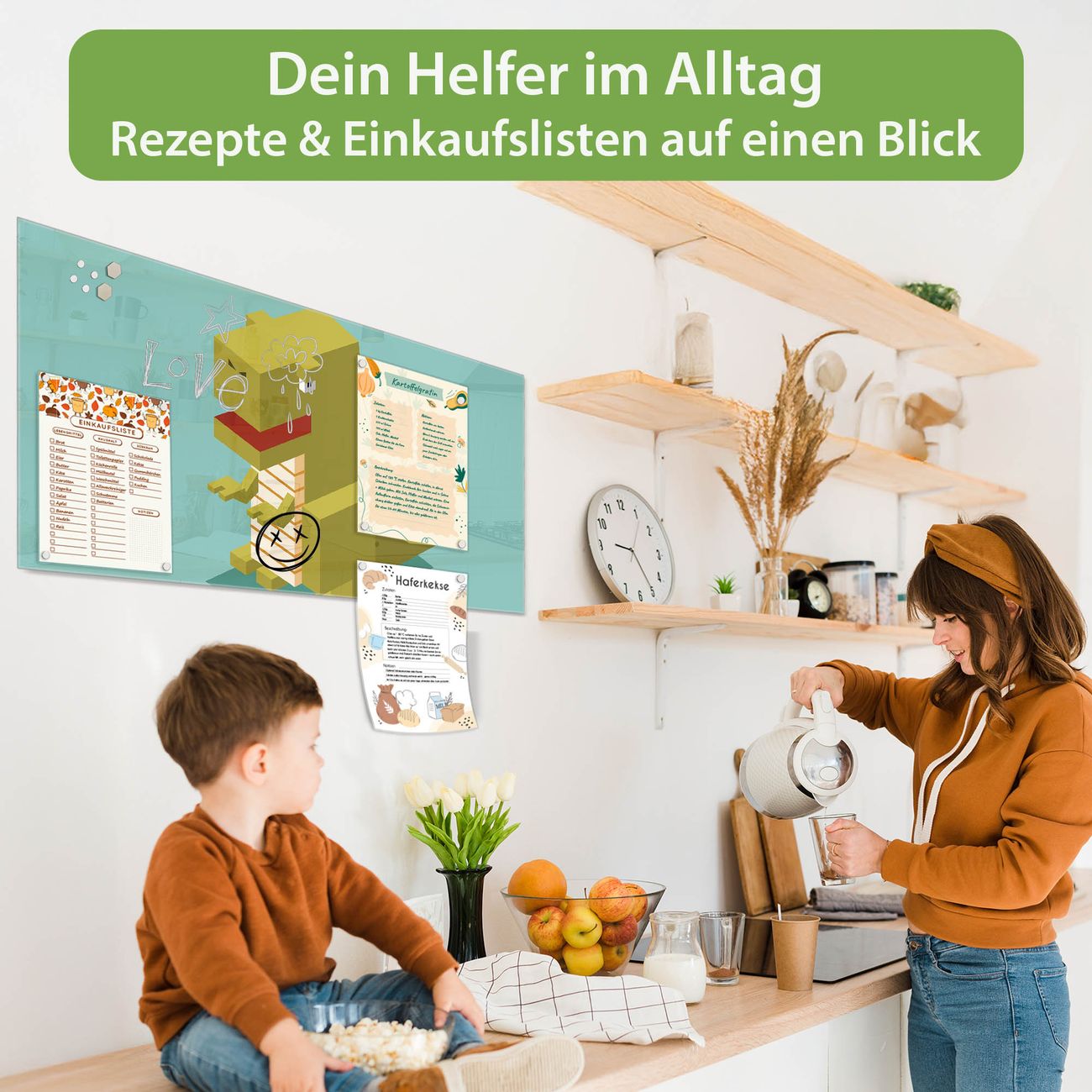 Auf der glatten Glasoberfläche lassen sich Termine, Rezepte oder Notizen ganz einfach mit Kreidestiften festhalten und rückstandslos entfernen. Starke Neodym-Magnete halten Ihre wichtigsten Erinnerungen sicher an Ort und Stelle. So entsteht Ihre ganz persönliche Ideenwand - jeden Tag neu.