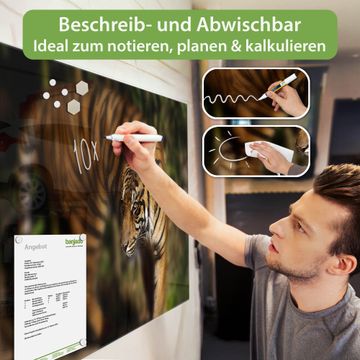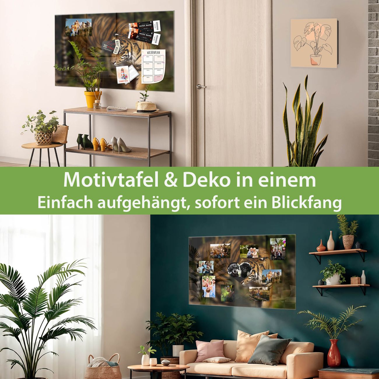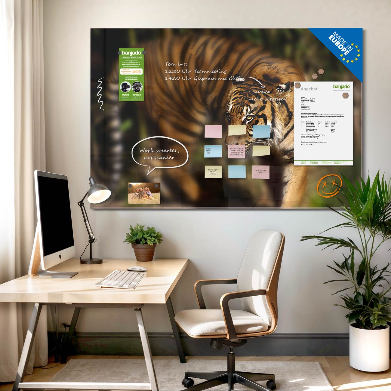 Die banjado Glas Magnettafel mit dem Motiv Motiv Tiger verbindet Funktionalität mit Stil. Sie ersetzt das Zettelchaos durch klare Strukturen und bringt dabei eine warme, natürliche Atmosphäre in Ihr Zuhause. Ob im Büro, in der Küche oder im Eingangsbereich - dieses Design-Board zieht Blicke an und sorgt für Ordnung mit Charakter.