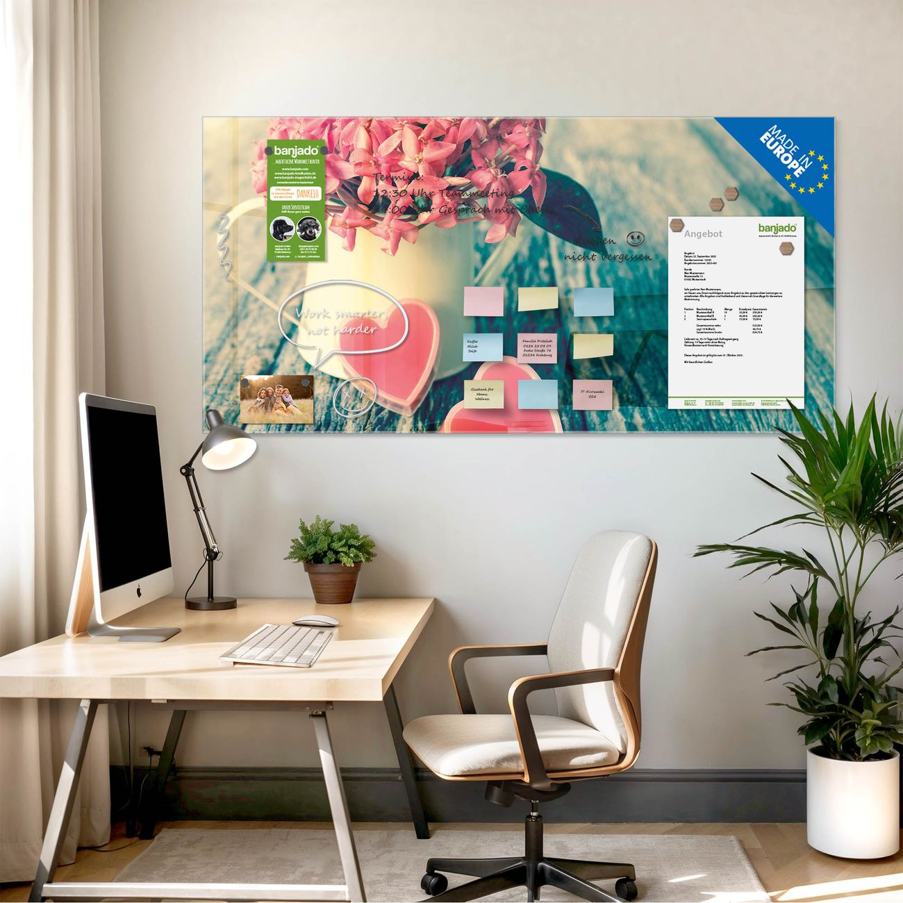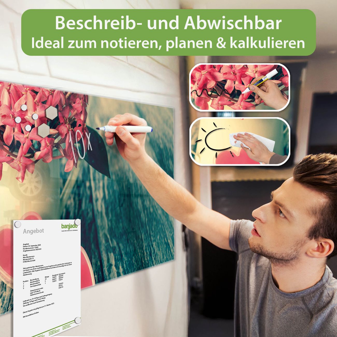 Jede Glas Magnettafel wird in unserer Werkstatt von Hand gefertigt und sorgfältig geprüft. So erhalten Sie ein echtes Qualitätsprodukt, das Funktion und Ästhetik perfekt vereint.?? Warum banjado?