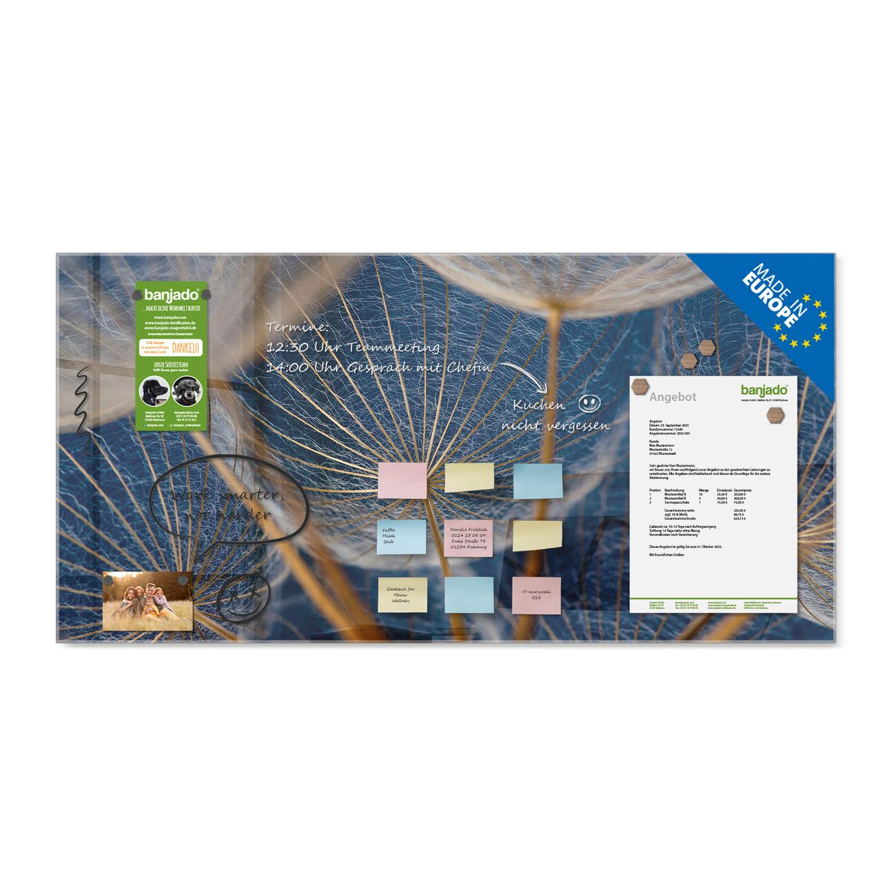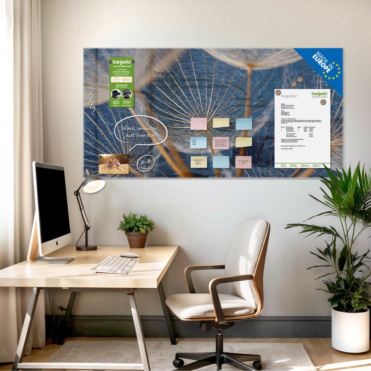 Jede Glas Magnettafel wird in unserer Werkstatt von Hand gefertigt und sorgfältig geprüft. So erhalten Sie ein echtes Qualitätsprodukt, das Funktion und Ästhetik perfekt vereint.?? Warum banjado?