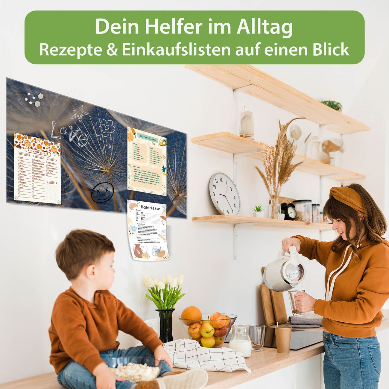 Auf der glatten Glasoberfläche lassen sich Termine, Rezepte oder Notizen ganz einfach mit Kreidestiften festhalten und rückstandslos entfernen. Starke Neodym-Magnete halten Ihre wichtigsten Erinnerungen sicher an Ort und Stelle. So entsteht Ihre ganz persönliche Ideenwand - jeden Tag neu.