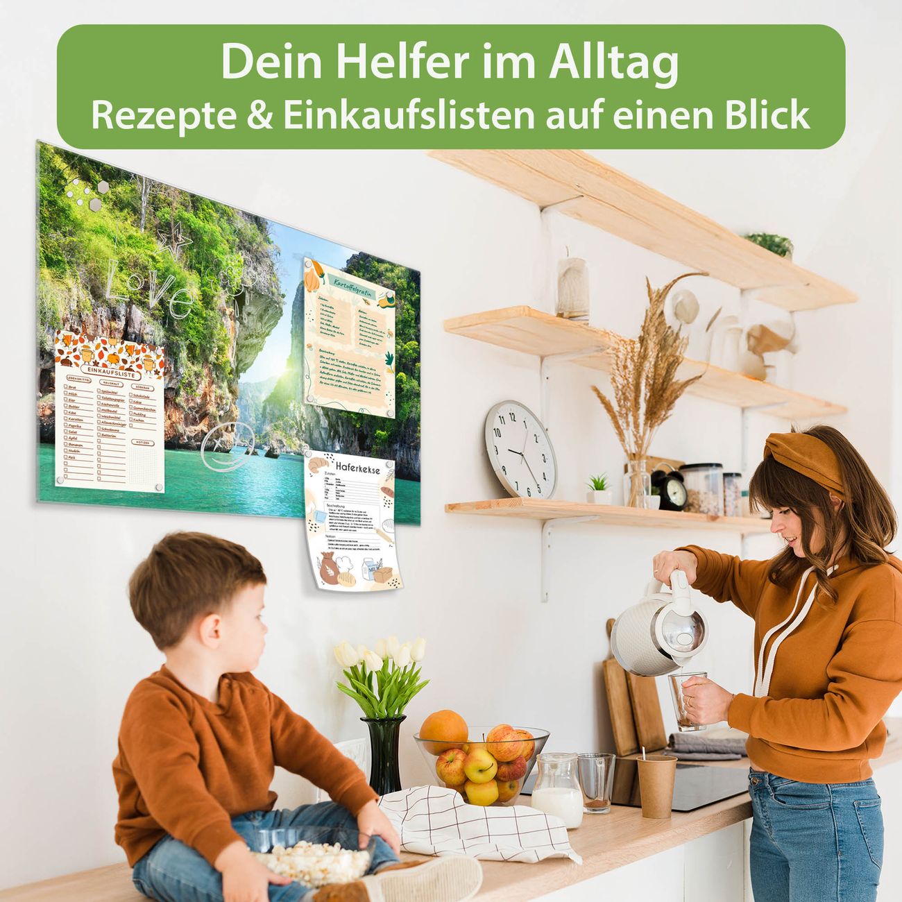 Ein Stück Design, das Ihren Alltag organisiert. Schreiben, heften, inspirieren - alles an einem Ort. Qualität, die man spürt. Montage leicht gemacht. Handwerk mit Herz - veredelt in Sachsen. Einzigartiges Design mit Motiv Motiv Versteckte Bucht Beschreibbare Glasoberfläche, leicht zu reinigen Starke Magnetkraft durch Stahlrückwand Inklusive 4 Neodym-Magneten Flexible Montageoptionen Handveredelt in Sachsen - Qualität, die bleibt