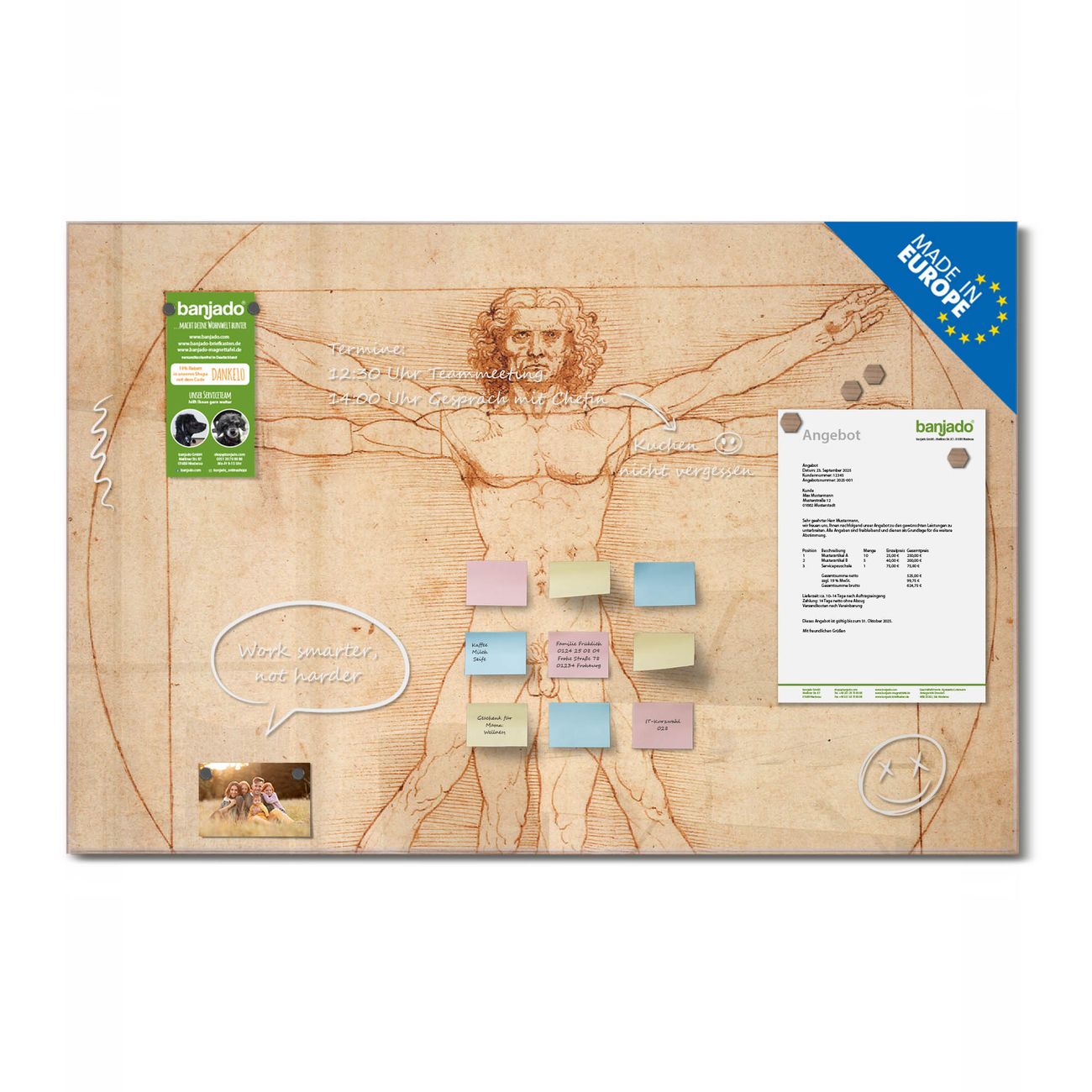 Ein Stück Design, das Ihren Alltag organisiert. Schreiben, heften, inspirieren - alles an einem Ort. Qualität, die man spürt. Montage leicht gemacht. Handwerk mit Herz - veredelt in Sachsen. Einzigartiges Design mit Motiv Motiv Vitruvianische Figur Beschreibbare Glasoberfläche, leicht zu reinigen Starke Magnetkraft durch Stahlrückwand Inklusive 4 Neodym-Magneten Flexible Montageoptionen Handveredelt in Sachsen - Qualität, die bleibt