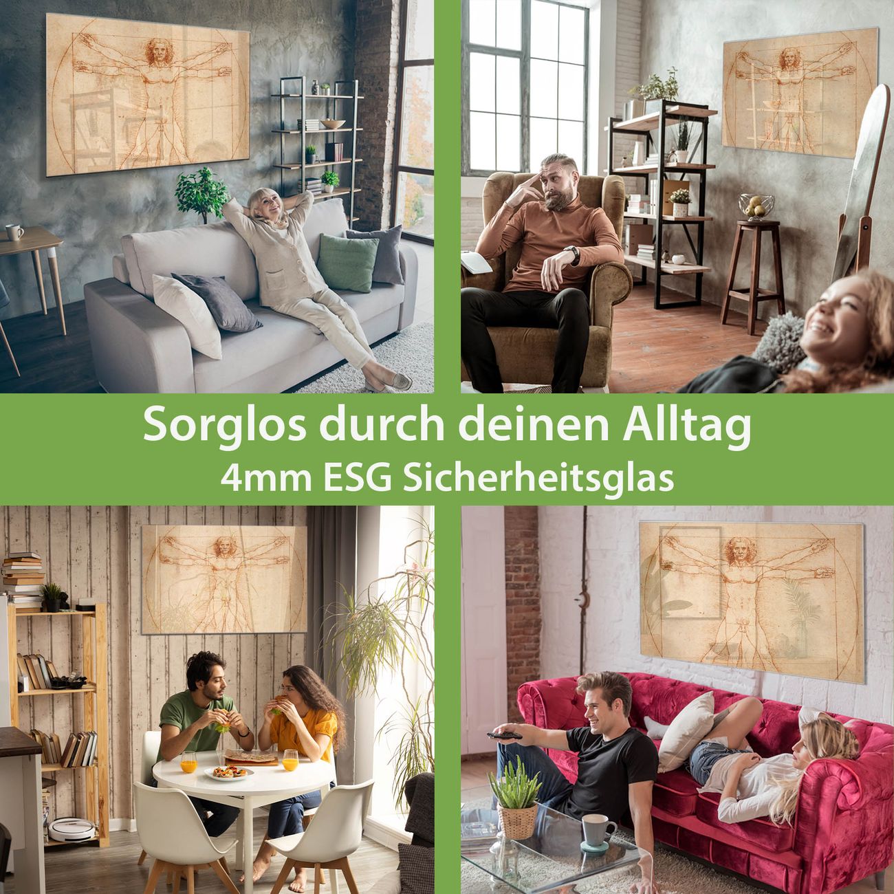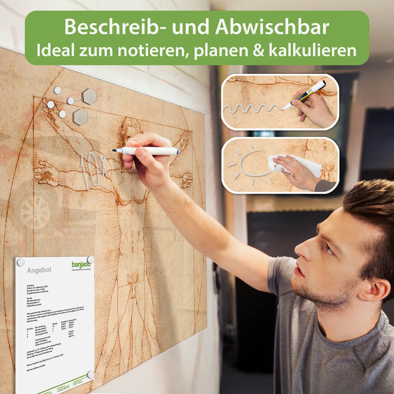 Die banjado Glas Magnettafel mit dem Motiv Motiv Vitruvianische Figur verbindet Funktionalität mit Stil. Sie ersetzt das Zettelchaos durch klare Strukturen und bringt dabei eine warme, natürliche Atmosphäre in Ihr Zuhause. Ob im Büro, in der Küche oder im Eingangsbereich - dieses Design-Board zieht Blicke an und sorgt für Ordnung mit Charakter.
