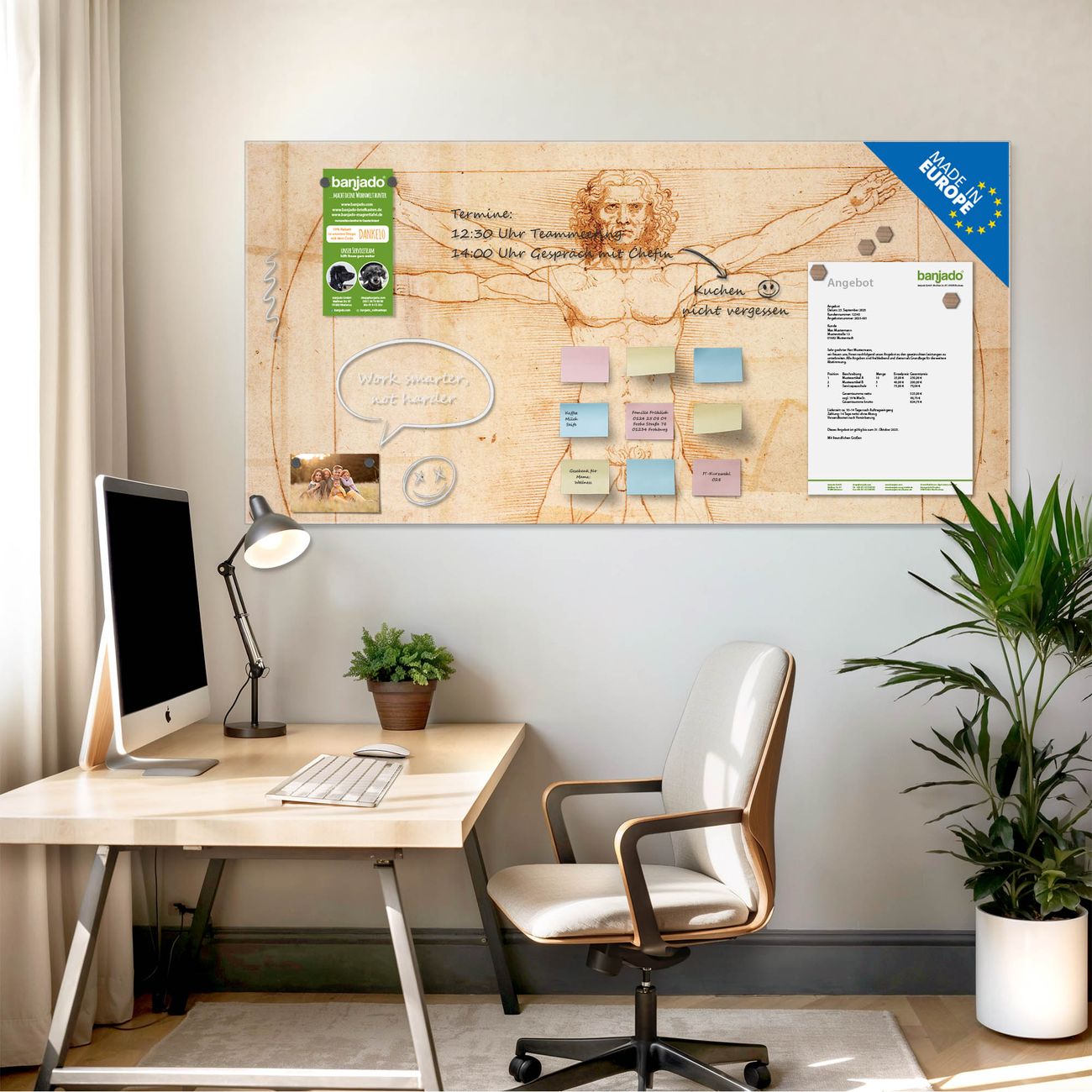 Jede Glas Magnettafel wird in unserer Werkstatt von Hand gefertigt und sorgfältig geprüft. So erhalten Sie ein echtes Qualitätsprodukt, das Funktion und Ästhetik perfekt vereint.?? Warum banjado?