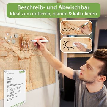 Die banjado Glas Magnettafel mit dem Motiv Motiv Vitruvianische Figur verbindet Funktionalität mit Stil. Sie ersetzt das Zettelchaos durch klare Strukturen und bringt dabei eine warme, natürliche Atmosphäre in Ihr Zuhause. Ob im Büro, in der Küche oder im Eingangsbereich - dieses Design-Board zieht Blicke an und sorgt für Ordnung mit Charakter.