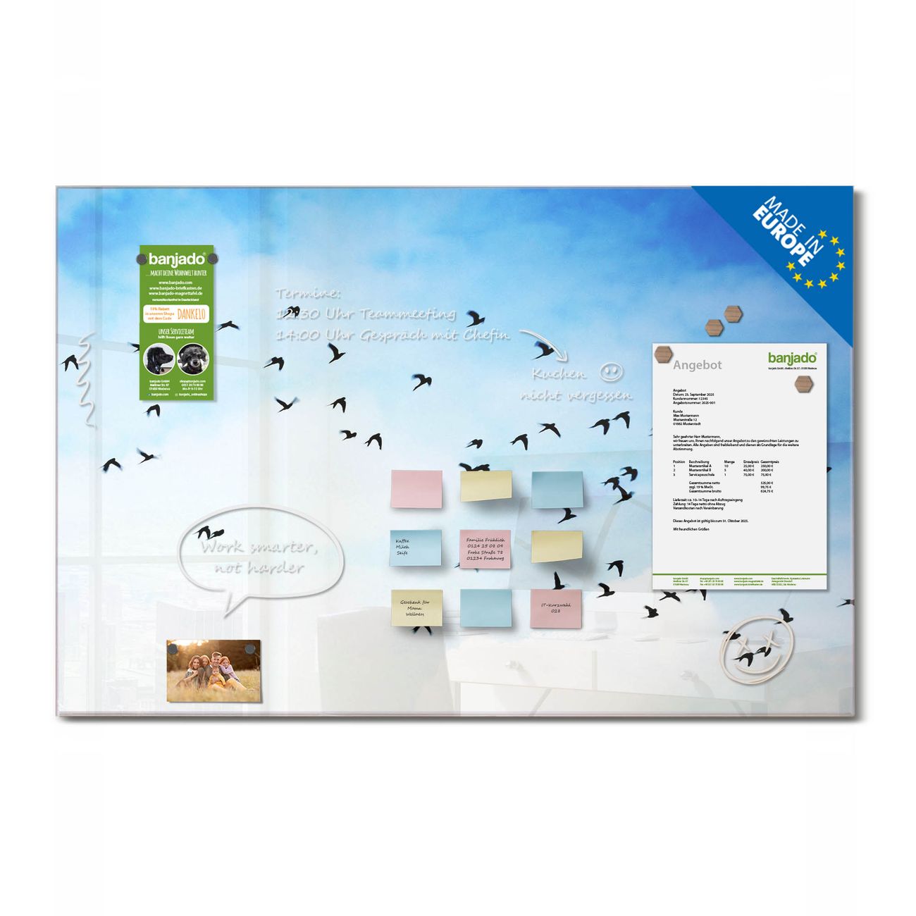 Jede Glas Magnettafel wird in unserer Werkstatt von Hand gefertigt und sorgfältig geprüft. So erhalten Sie ein echtes Qualitätsprodukt, das Funktion und Ästhetik perfekt vereint.?? Warum banjado?