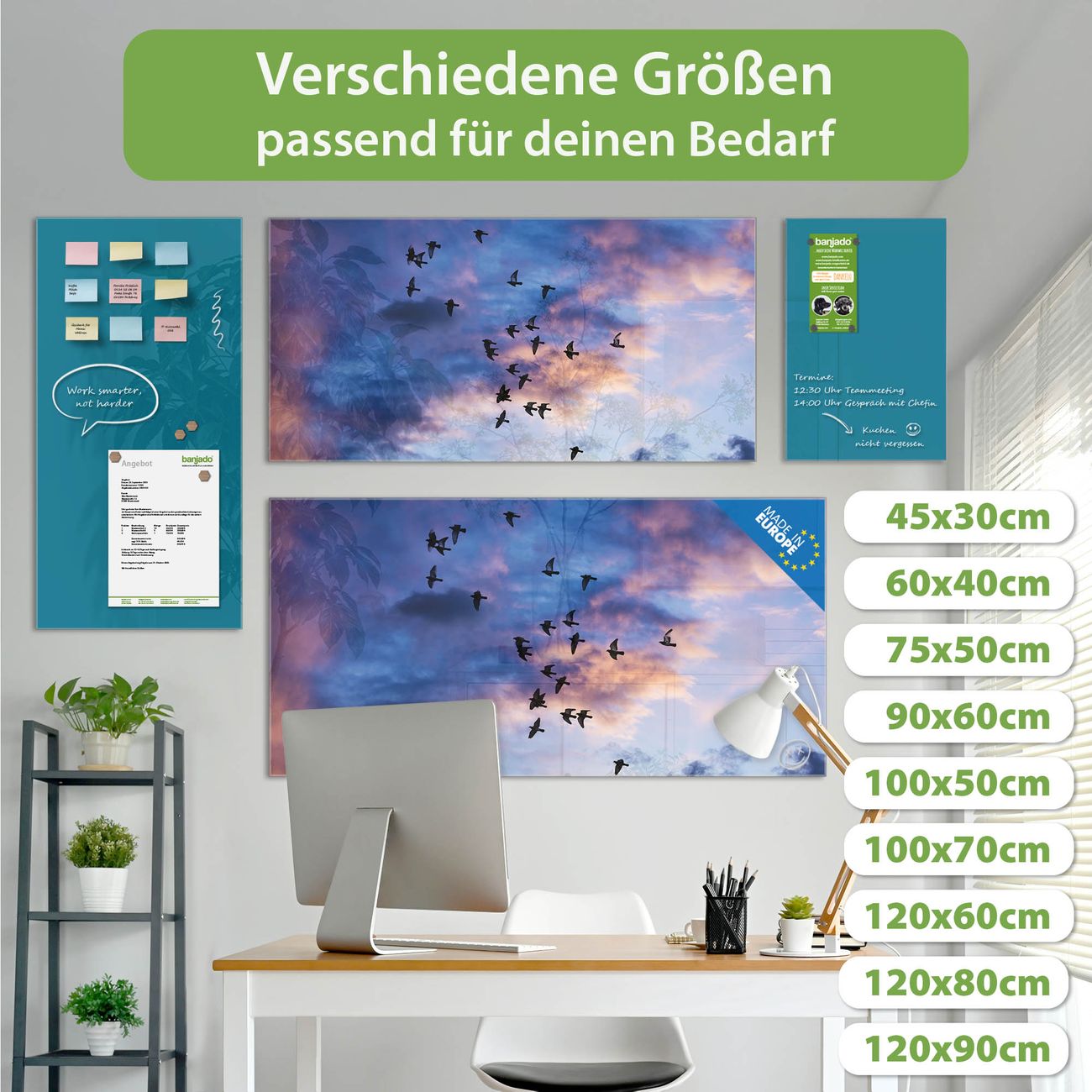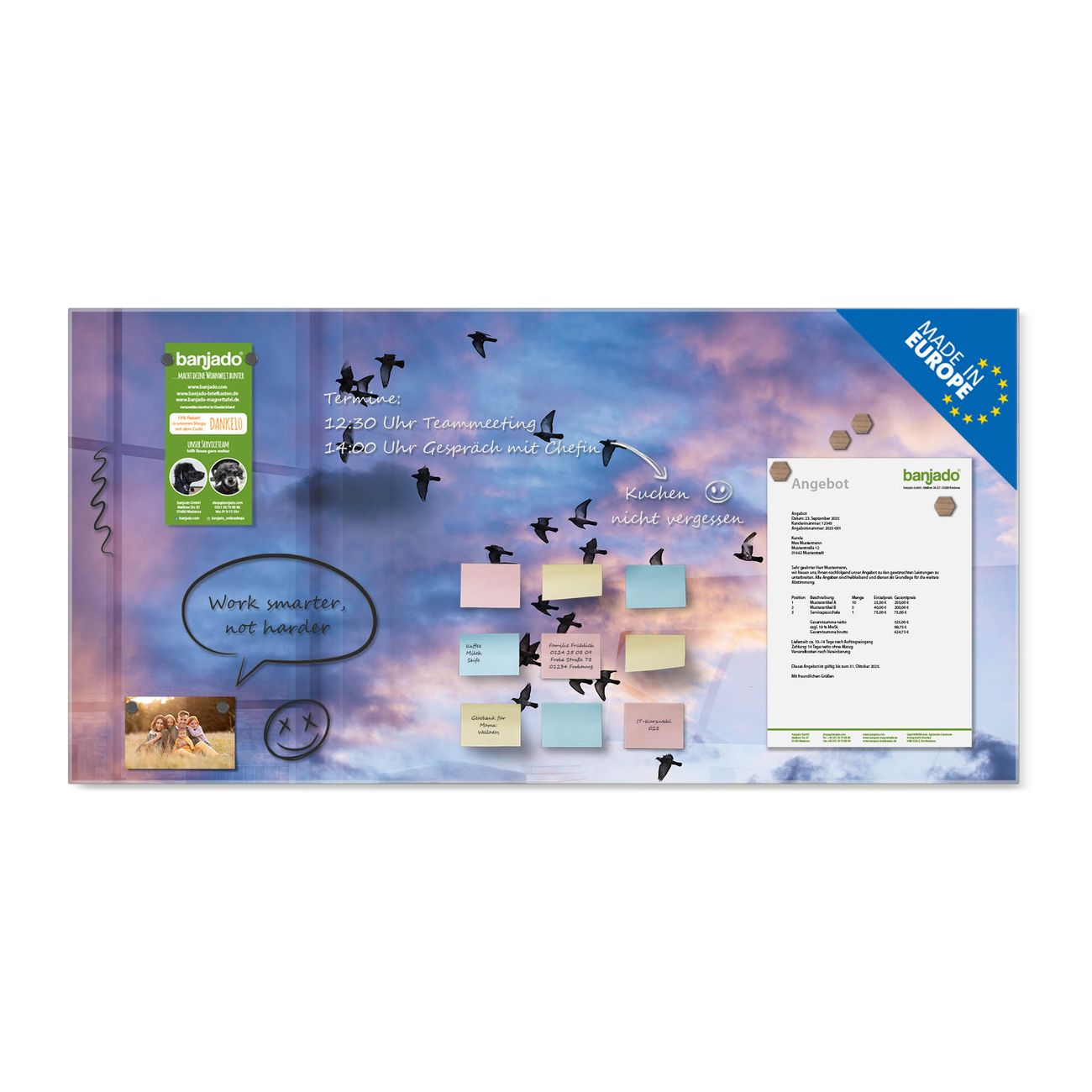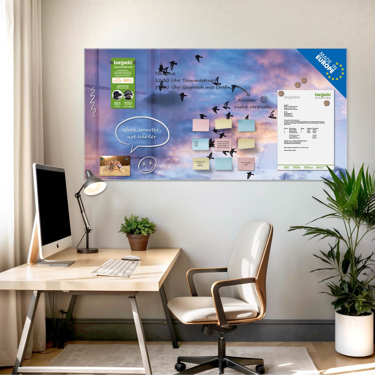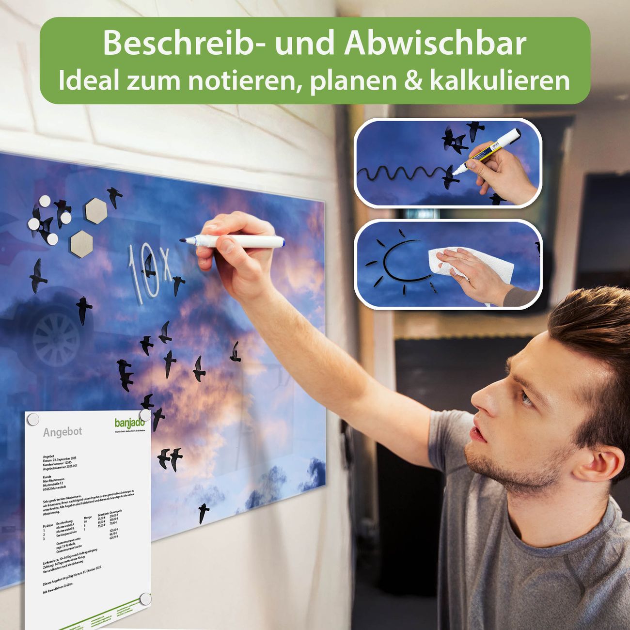 Jede Glas Magnettafel wird in unserer Werkstatt von Hand gefertigt und sorgfältig geprüft. So erhalten Sie ein echtes Qualitätsprodukt, das Funktion und Ästhetik perfekt vereint.?? Warum banjado?