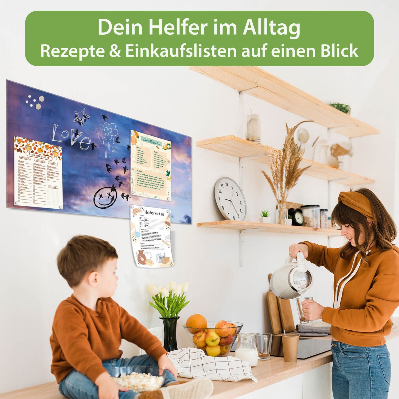 Auf der glatten Glasoberfläche lassen sich Termine, Rezepte oder Notizen ganz einfach mit Kreidestiften festhalten und rückstandslos entfernen. Starke Neodym-Magnete halten Ihre wichtigsten Erinnerungen sicher an Ort und Stelle. So entsteht Ihre ganz persönliche Ideenwand - jeden Tag neu.