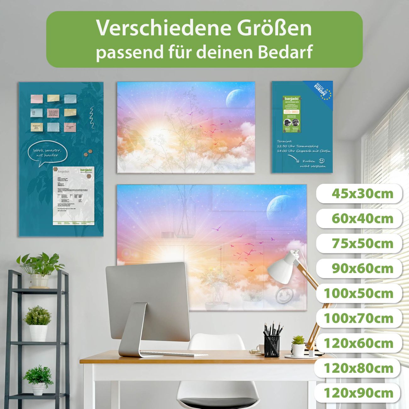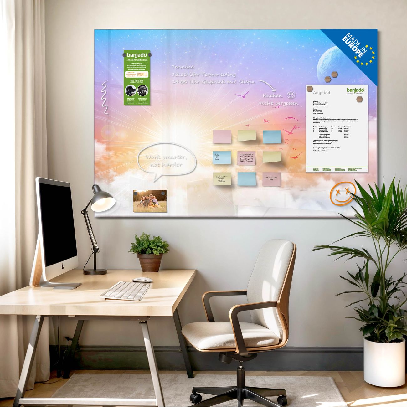 Jede Glas Magnettafel wird in unserer Werkstatt von Hand gefertigt und sorgfältig geprüft. So erhalten Sie ein echtes Qualitätsprodukt, das Funktion und Ästhetik perfekt vereint.?? Warum banjado?