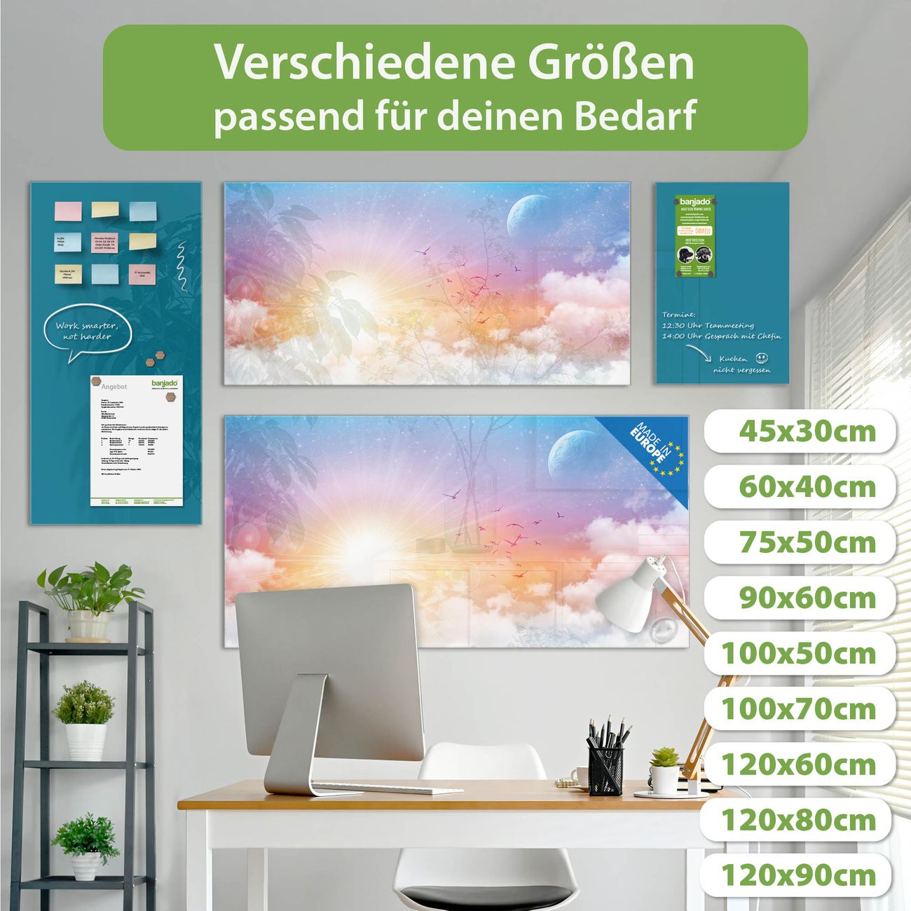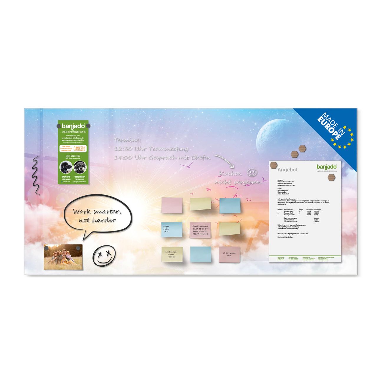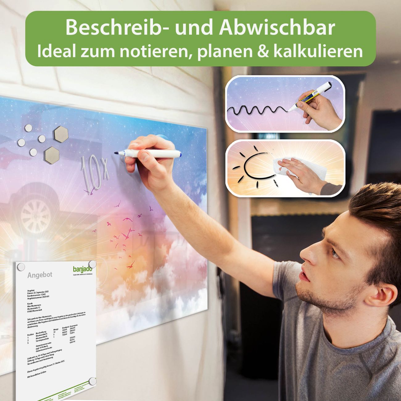 Jede Glas Magnettafel wird in unserer Werkstatt von Hand gefertigt und sorgfältig geprüft. So erhalten Sie ein echtes Qualitätsprodukt, das Funktion und Ästhetik perfekt vereint.?? Warum banjado?