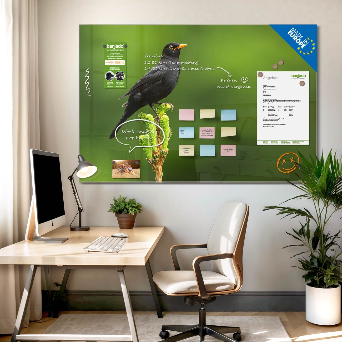 Jede Glas Magnettafel wird in unserer Werkstatt von Hand gefertigt und sorgfältig geprüft. So erhalten Sie ein echtes Qualitätsprodukt, das Funktion und Ästhetik perfekt vereint.?? Warum banjado?