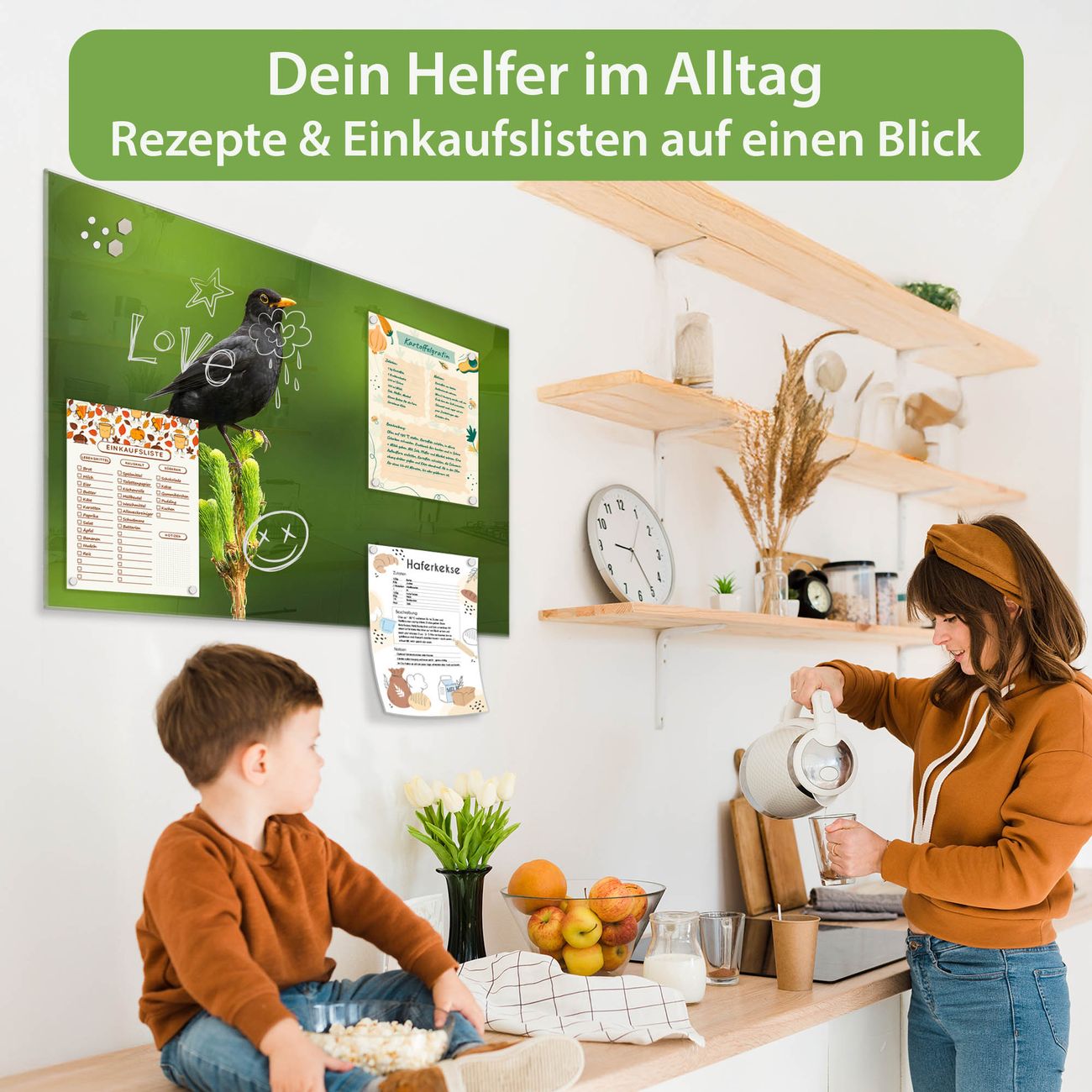 Auf der glatten Glasoberfläche lassen sich Termine, Rezepte oder Notizen ganz einfach mit Kreidestiften festhalten und rückstandslos entfernen. Starke Neodym-Magnete halten Ihre wichtigsten Erinnerungen sicher an Ort und Stelle. So entsteht Ihre ganz persönliche Ideenwand - jeden Tag neu.