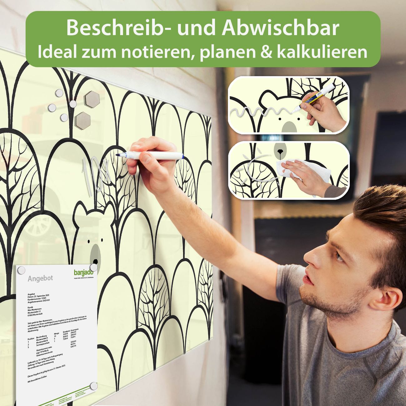 Jede Glas Magnettafel wird in unserer Werkstatt von Hand gefertigt und sorgfältig geprüft. So erhalten Sie ein echtes Qualitätsprodukt, das Funktion und Ästhetik perfekt vereint.?? Warum banjado?