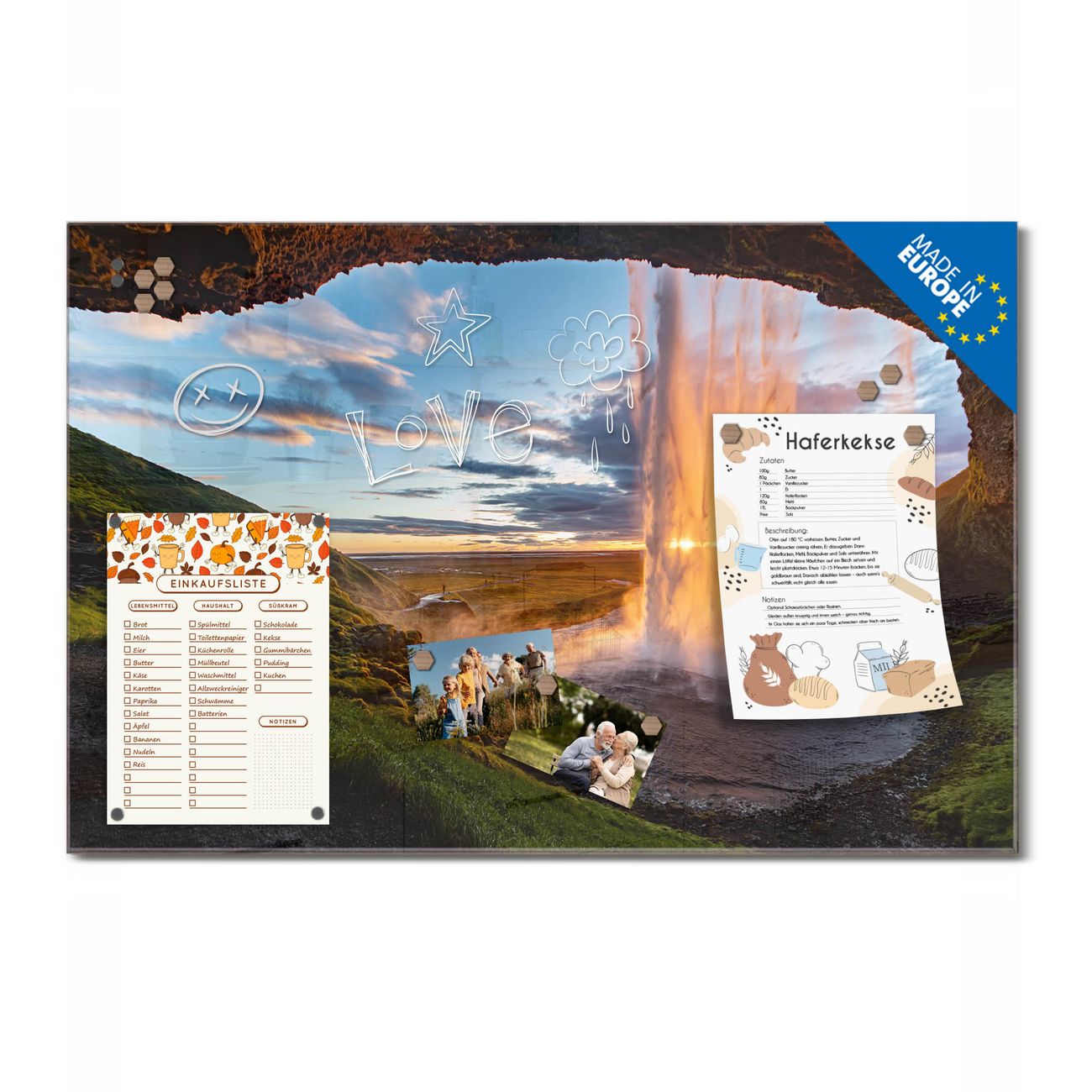 Die banjado Glas Magnettafel mit dem Motiv Motiv Wasserfall im Sonnenlicht verbindet Funktionalität mit Stil. Sie ersetzt das Zettelchaos durch klare Strukturen und bringt dabei eine warme, natürliche Atmosphäre in Ihr Zuhause. Ob im Büro, in der Küche oder im Eingangsbereich - dieses Design-Board zieht Blicke an und sorgt für Ordnung mit Charakter.