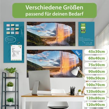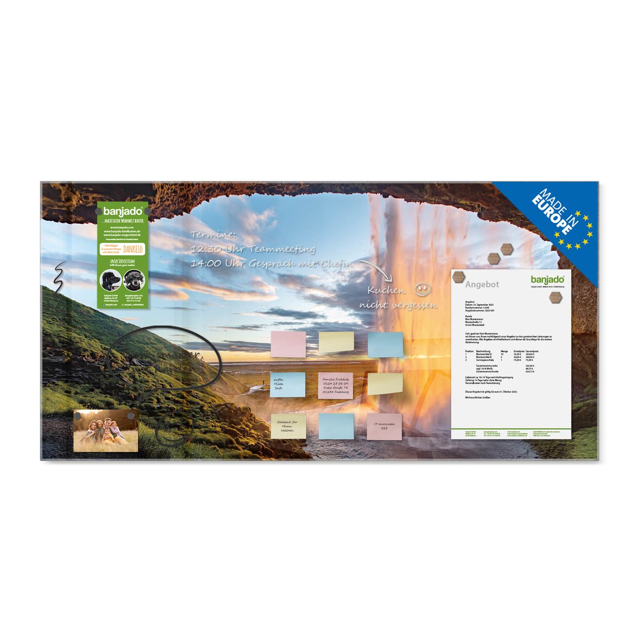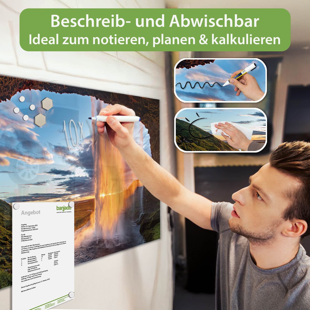Die banjado Glas Magnettafel mit dem Motiv Motiv Wasserfall im Sonnenlicht verbindet Funktionalität mit Stil. Sie ersetzt das Zettelchaos durch klare Strukturen und bringt dabei eine warme, natürliche Atmosphäre in Ihr Zuhause. Ob im Büro, in der Küche oder im Eingangsbereich - dieses Design-Board zieht Blicke an und sorgt für Ordnung mit Charakter.