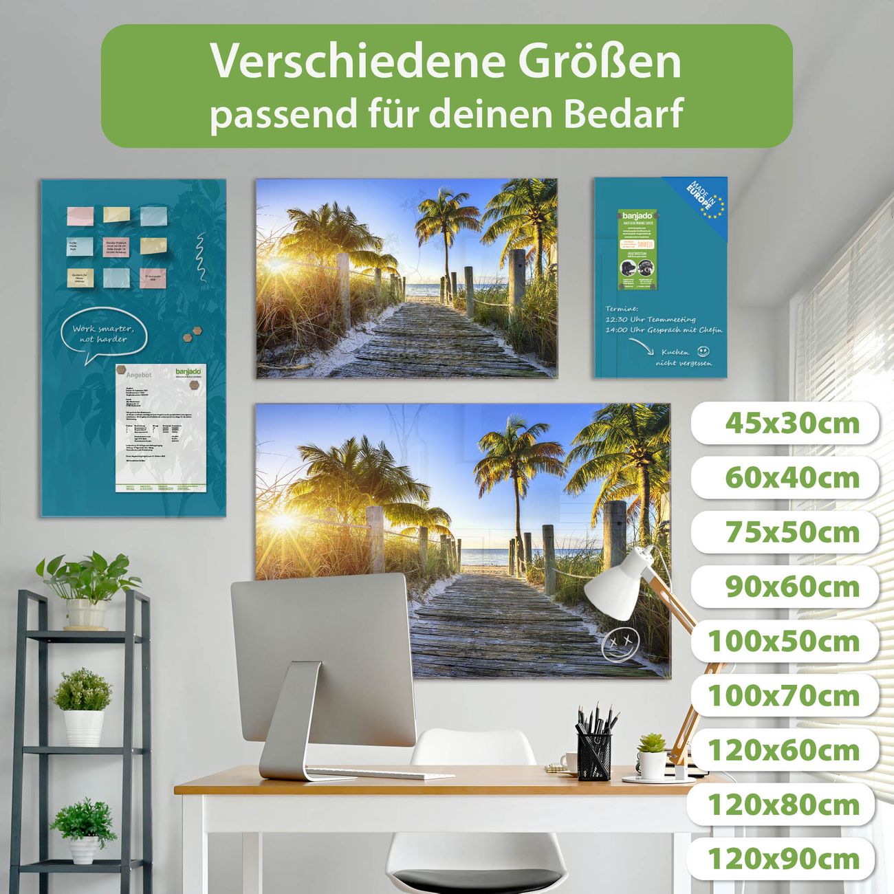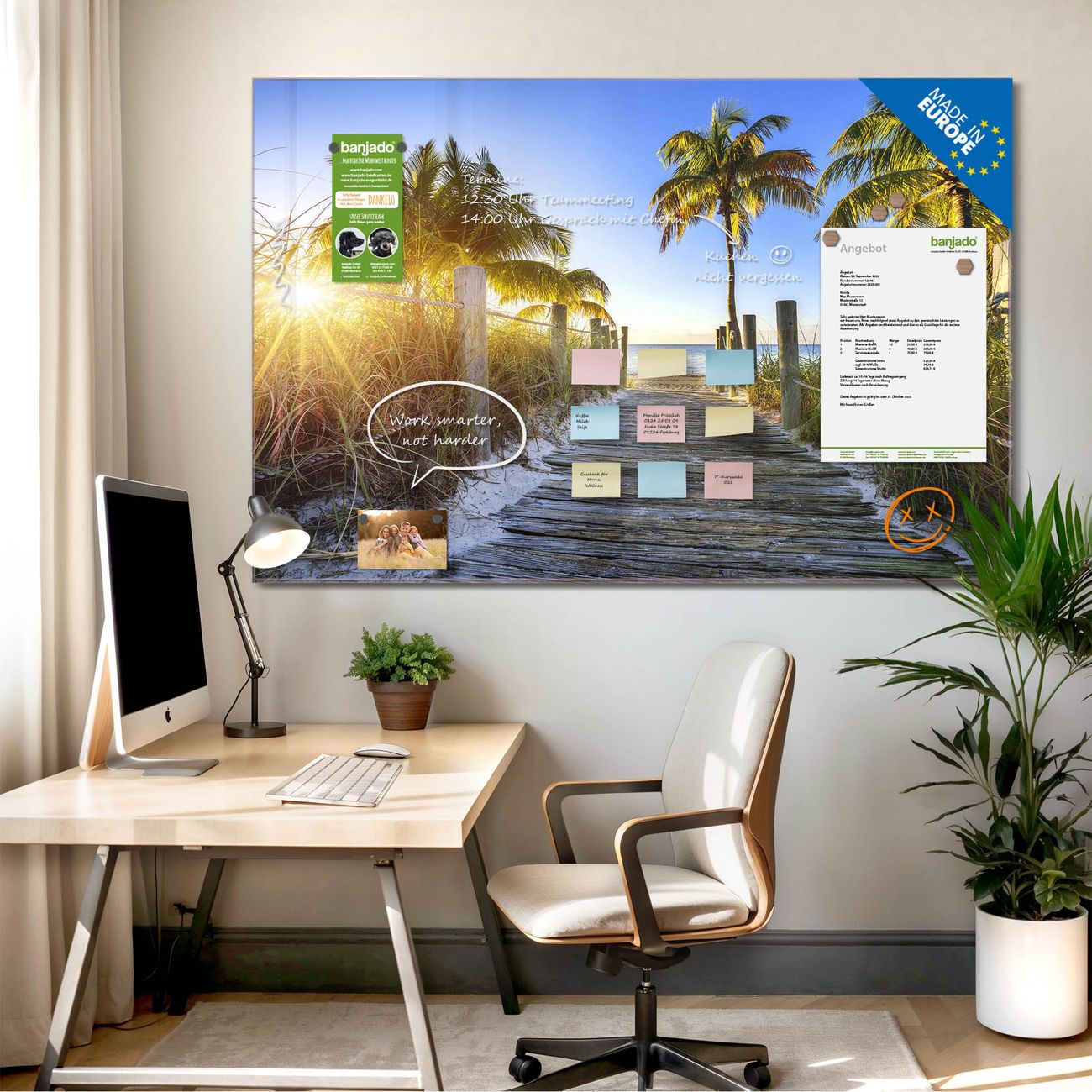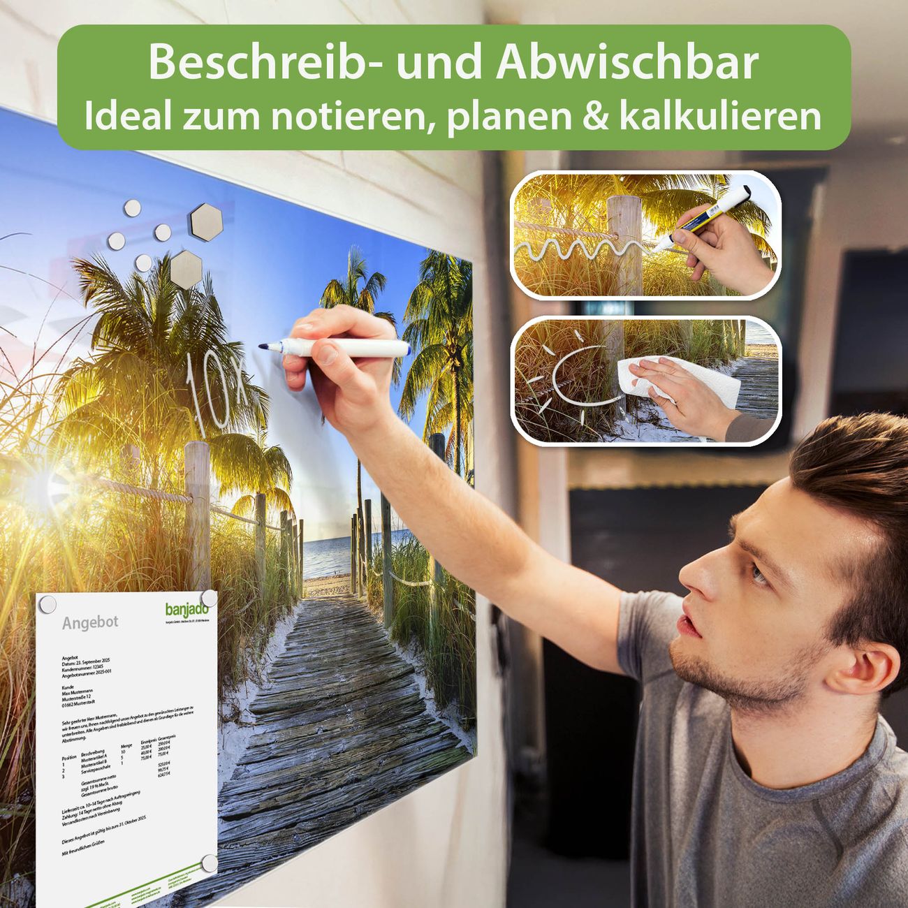 Jede Glas Magnettafel wird in unserer Werkstatt von Hand gefertigt und sorgfältig geprüft. So erhalten Sie ein echtes Qualitätsprodukt, das Funktion und Ästhetik perfekt vereint.?? Warum banjado?