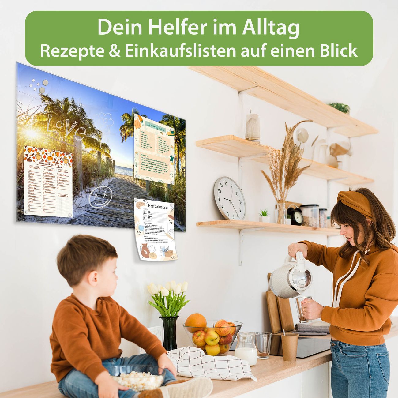 Auf der glatten Glasoberfläche lassen sich Termine, Rezepte oder Notizen ganz einfach mit Kreidestiften festhalten und rückstandslos entfernen. Starke Neodym-Magnete halten Ihre wichtigsten Erinnerungen sicher an Ort und Stelle. So entsteht Ihre ganz persönliche Ideenwand - jeden Tag neu.