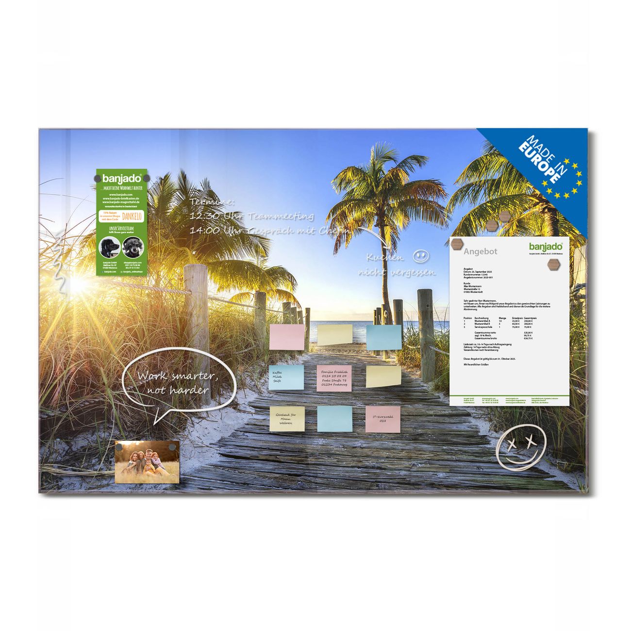 Jede Glas Magnettafel wird in unserer Werkstatt von Hand gefertigt und sorgfältig geprüft. So erhalten Sie ein echtes Qualitätsprodukt, das Funktion und Ästhetik perfekt vereint.?? Warum banjado?