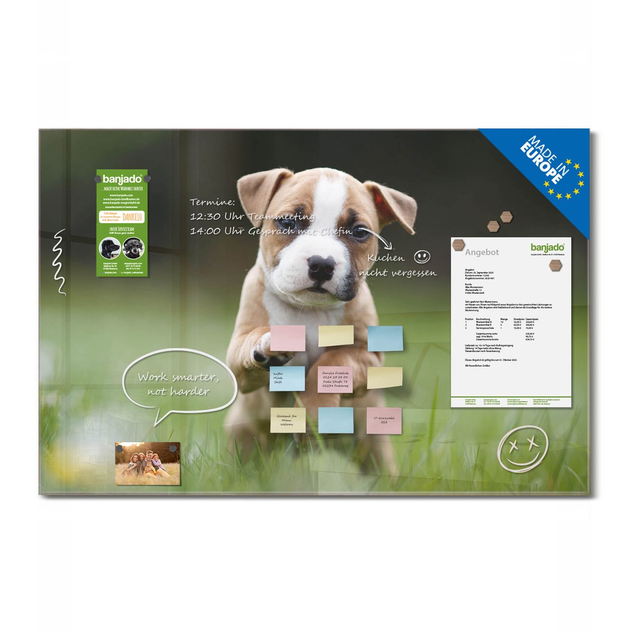 Ein Stück Design, das Ihren Alltag organisiert. Schreiben, heften, inspirieren - alles an einem Ort. Qualität, die man spürt. Montage leicht gemacht. Handwerk mit Herz - veredelt in Sachsen. Einzigartiges Design mit Motiv Motiv Welpe im Gras Beschreibbare Glasoberfläche, leicht zu reinigen Starke Magnetkraft durch Stahlrückwand Inklusive 4 Neodym-Magneten Flexible Montageoptionen Handveredelt in Sachsen - Qualität, die bleibt