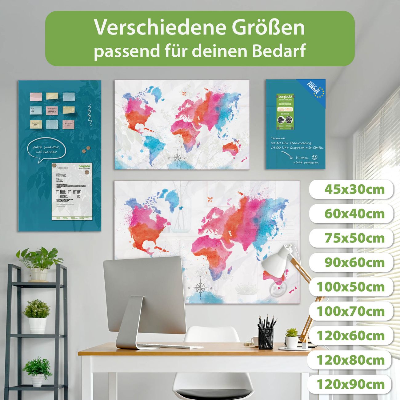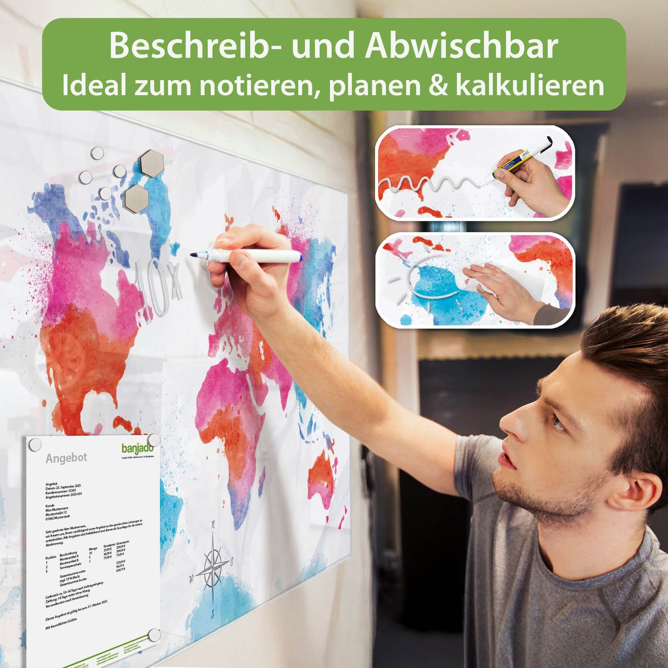 Jede Glas Magnettafel wird in unserer Werkstatt von Hand gefertigt und sorgfältig geprüft. So erhalten Sie ein echtes Qualitätsprodukt, das Funktion und Ästhetik perfekt vereint.?? Warum banjado?