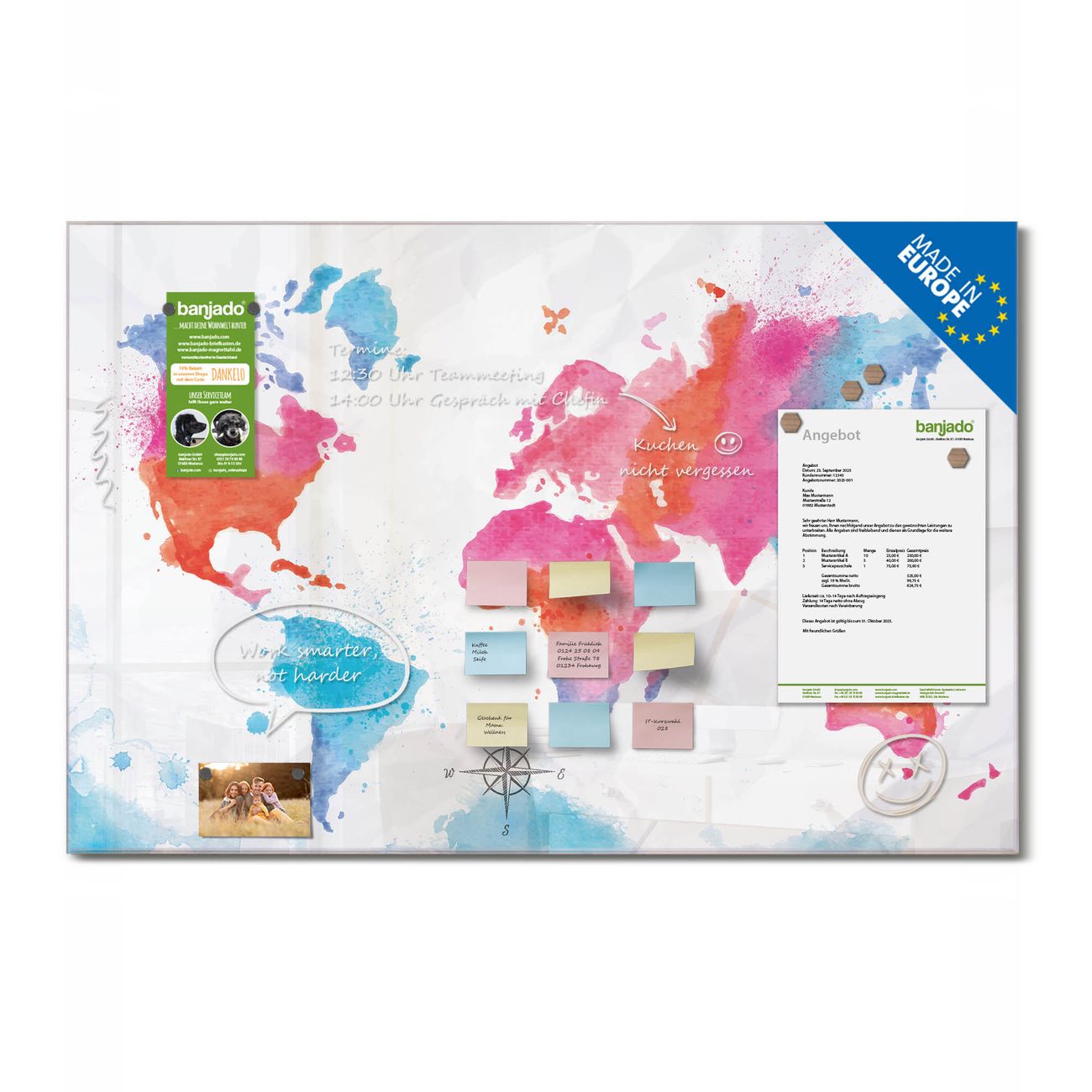 Jede Glas Magnettafel wird in unserer Werkstatt von Hand gefertigt und sorgfältig geprüft. So erhalten Sie ein echtes Qualitätsprodukt, das Funktion und Ästhetik perfekt vereint.?? Warum banjado?