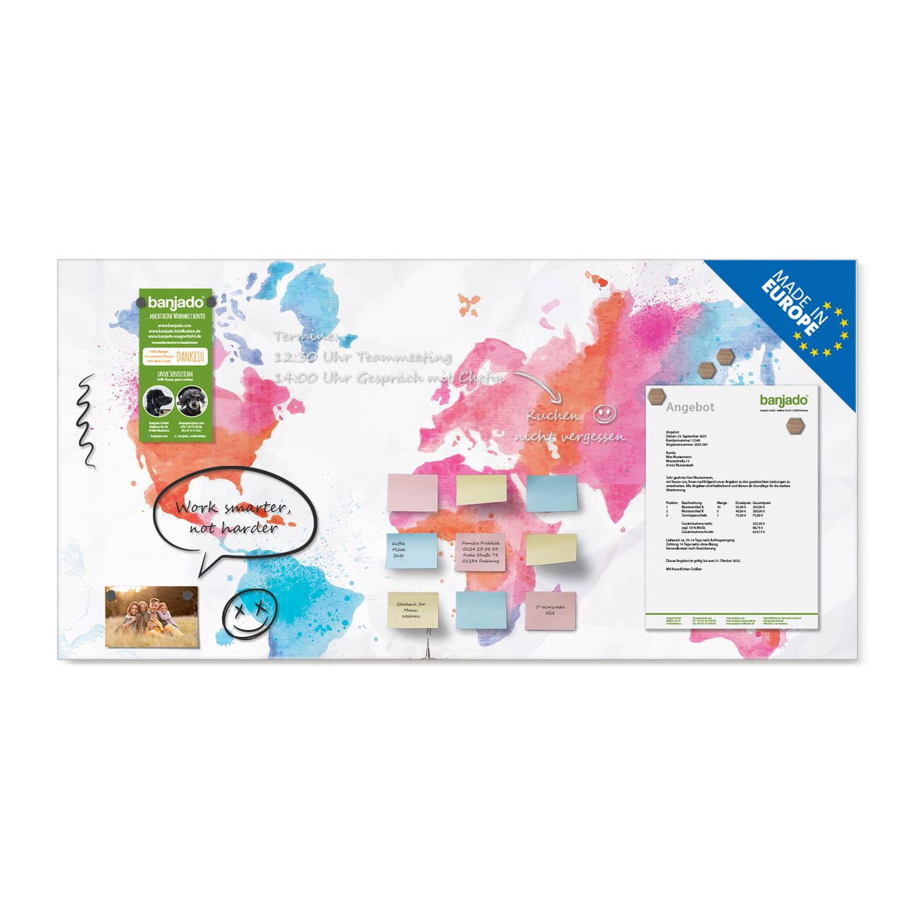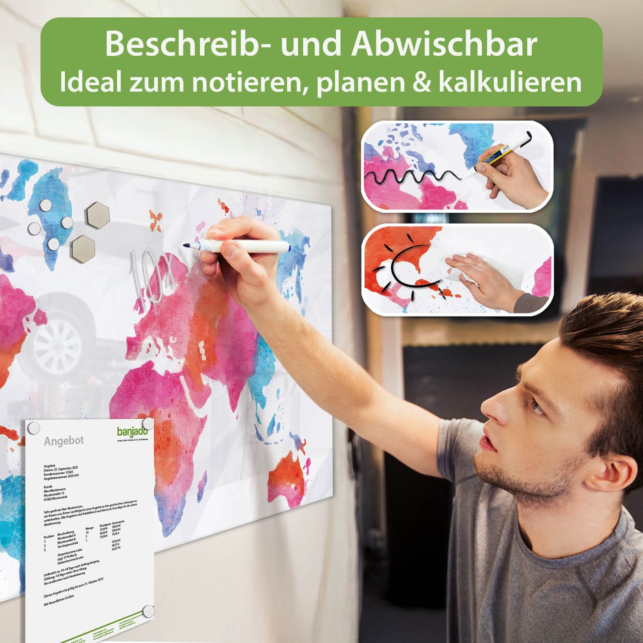 Jede Glas Magnettafel wird in unserer Werkstatt von Hand gefertigt und sorgfältig geprüft. So erhalten Sie ein echtes Qualitätsprodukt, das Funktion und Ästhetik perfekt vereint.?? Warum banjado?