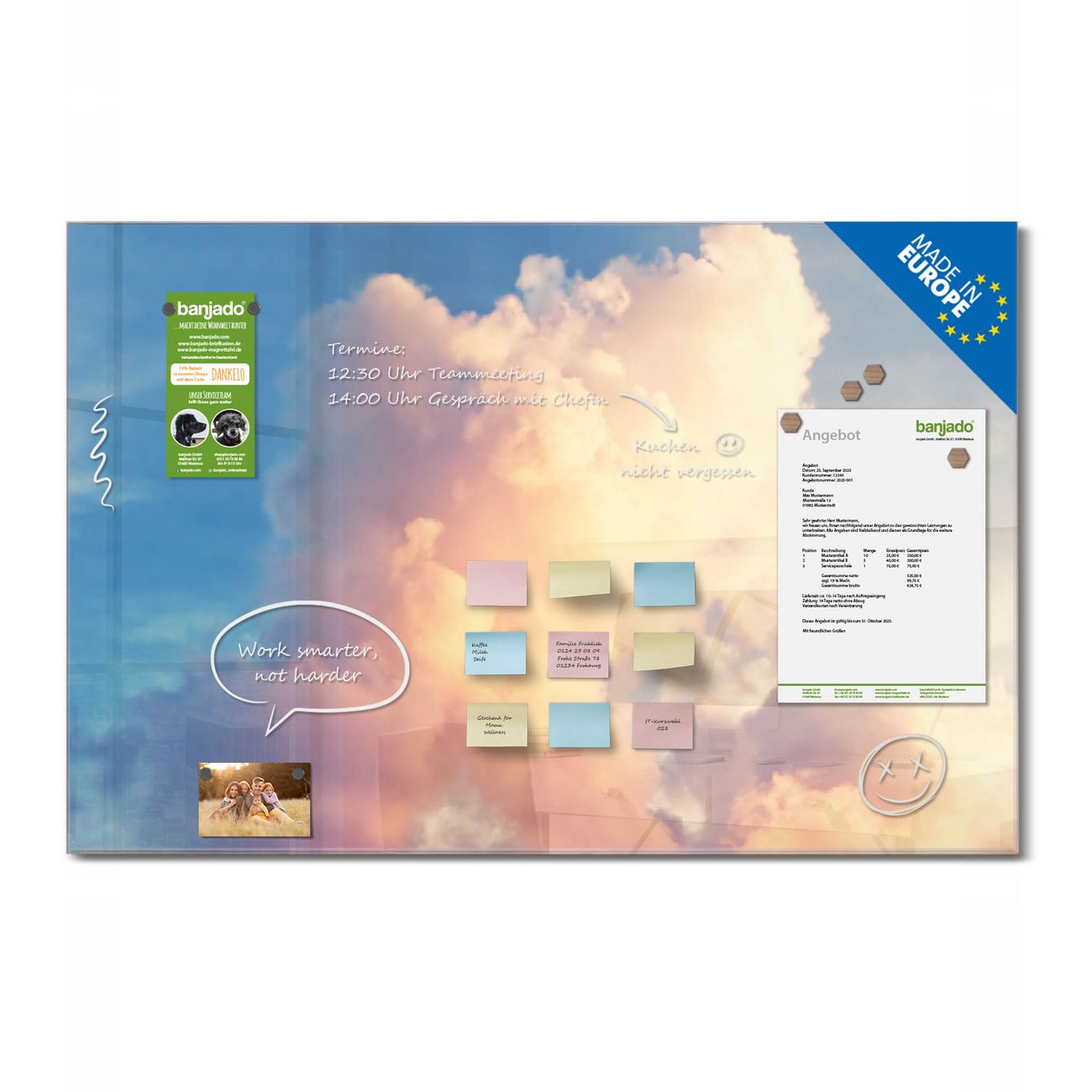 Jede Glas Magnettafel wird in unserer Werkstatt von Hand gefertigt und sorgfältig geprüft. So erhalten Sie ein echtes Qualitätsprodukt, das Funktion und Ästhetik perfekt vereint.?? Warum banjado?