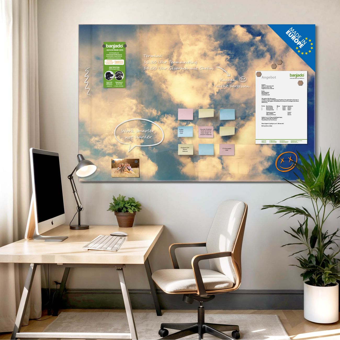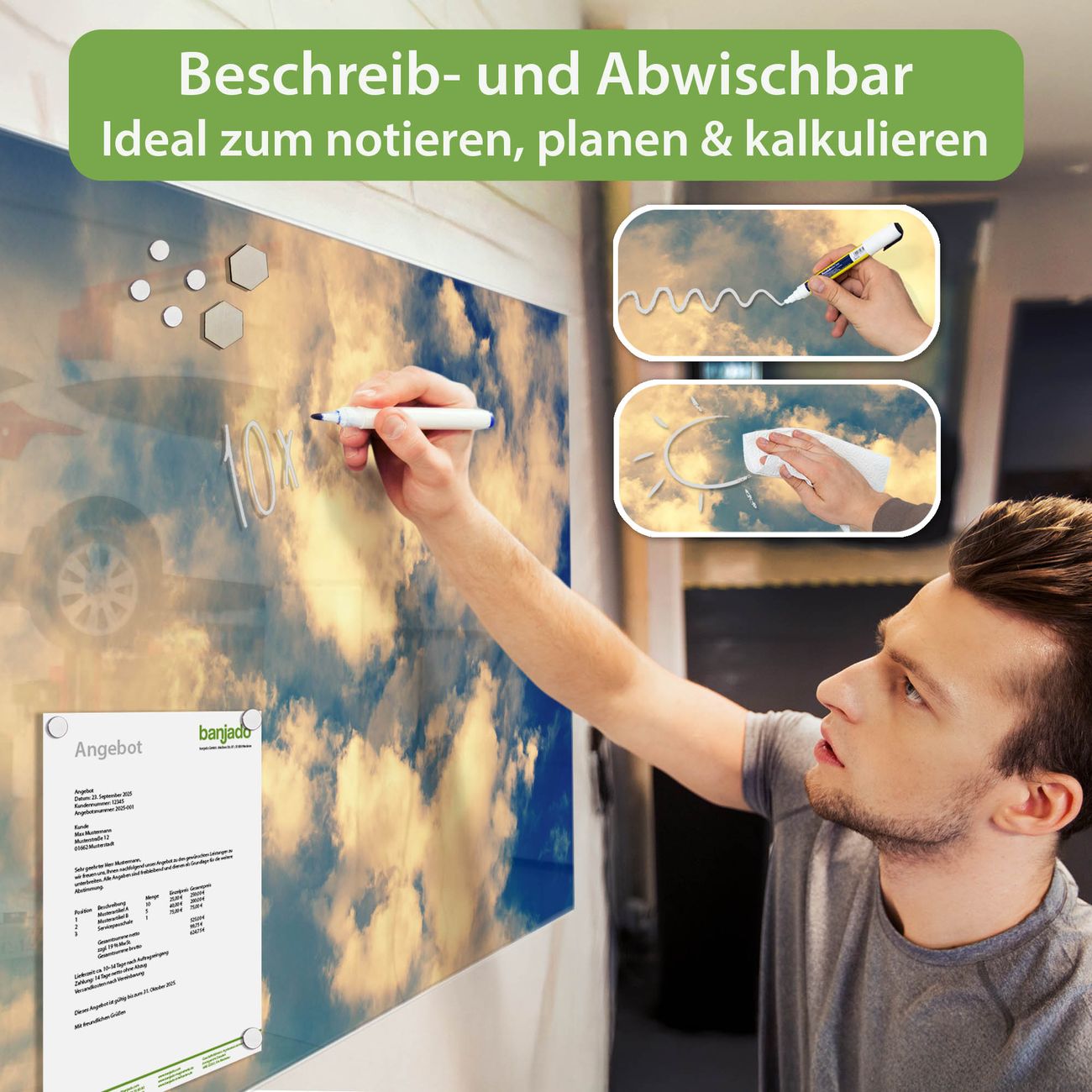 Die banjado Glas Magnettafel mit dem Motiv Motiv Wolken 3 verbindet Funktionalität mit Stil. Sie ersetzt das Zettelchaos durch klare Strukturen und bringt dabei eine warme, natürliche Atmosphäre in Ihr Zuhause. Ob im Büro, in der Küche oder im Eingangsbereich - dieses Design-Board zieht Blicke an und sorgt für Ordnung mit Charakter.