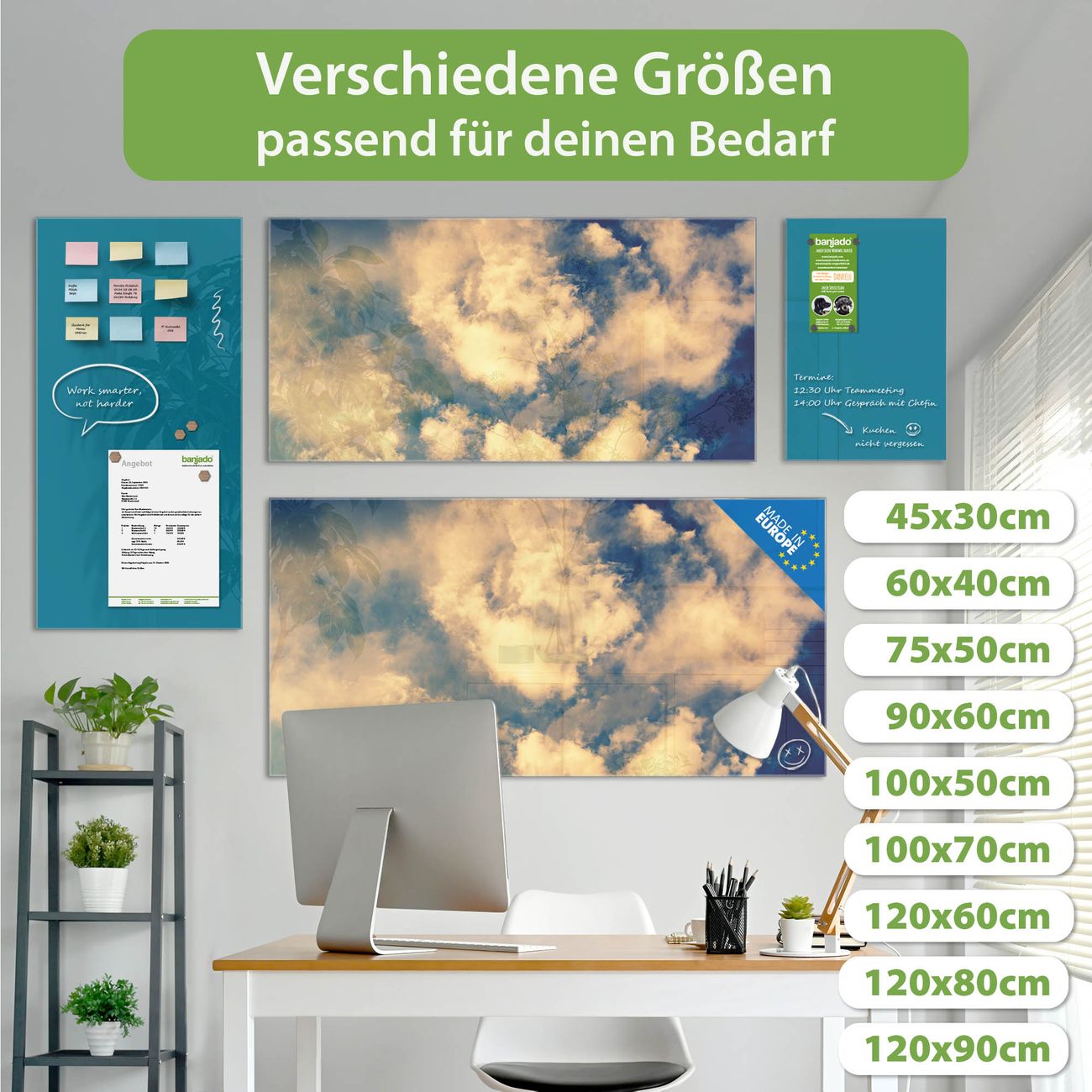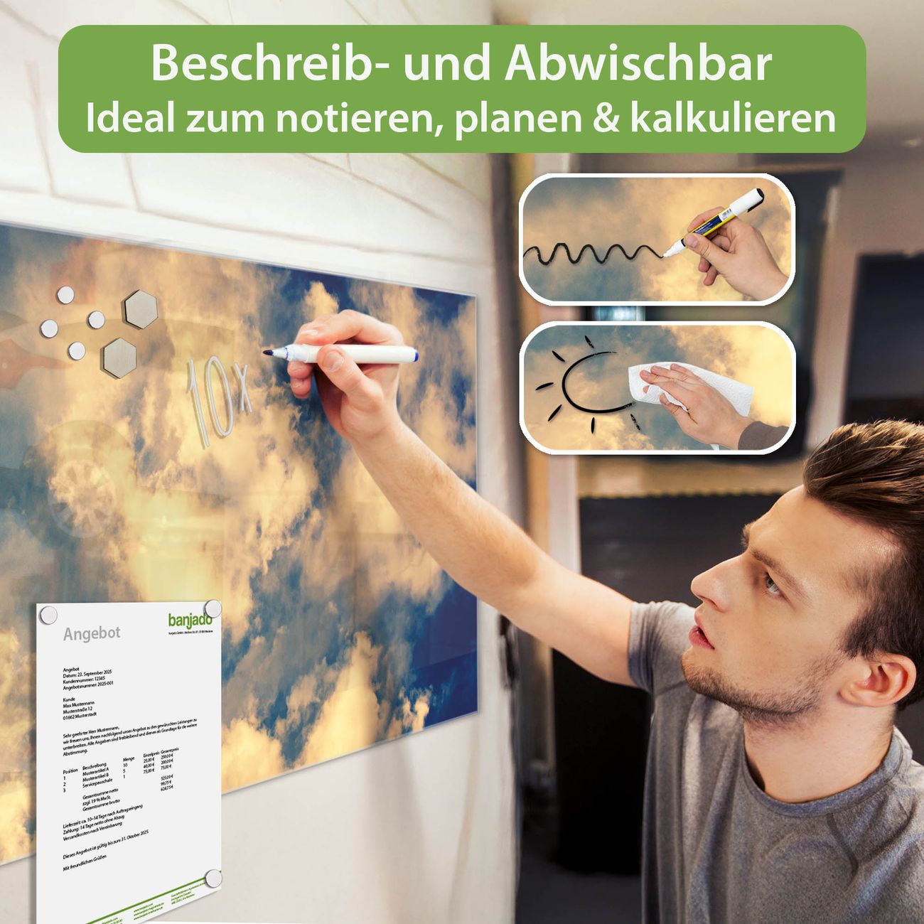 Jede Glas Magnettafel wird in unserer Werkstatt von Hand gefertigt und sorgfältig geprüft. So erhalten Sie ein echtes Qualitätsprodukt, das Funktion und Ästhetik perfekt vereint.?? Warum banjado?