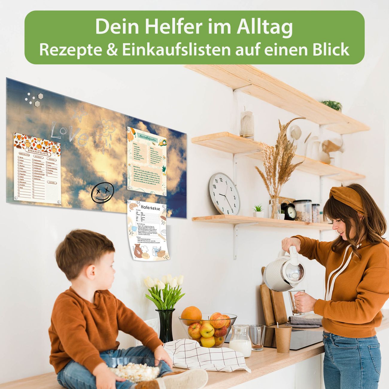Auf der glatten Glasoberfläche lassen sich Termine, Rezepte oder Notizen ganz einfach mit Kreidestiften festhalten und rückstandslos entfernen. Starke Neodym-Magnete halten Ihre wichtigsten Erinnerungen sicher an Ort und Stelle. So entsteht Ihre ganz persönliche Ideenwand - jeden Tag neu.