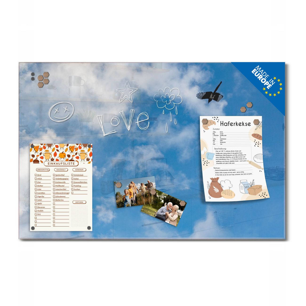 Ein Stück Design, das Ihren Alltag organisiert. Schreiben, heften, inspirieren - alles an einem Ort. Qualität, die man spürt. Montage leicht gemacht. Handwerk mit Herz - veredelt in Sachsen. Einzigartiges Design mit Motiv Motiv Wolken 4 Beschreibbare Glasoberfläche, leicht zu reinigen Starke Magnetkraft durch Stahlrückwand Inklusive 4 Neodym-Magneten Flexible Montageoptionen Handveredelt in Sachsen - Qualität, die bleibt