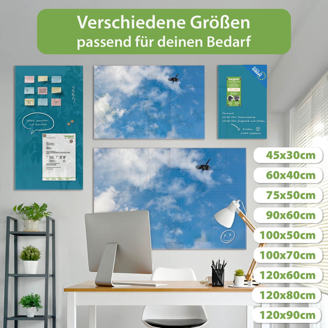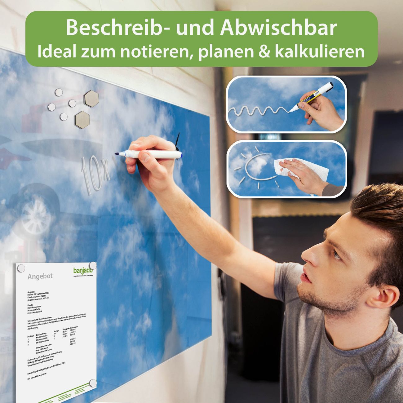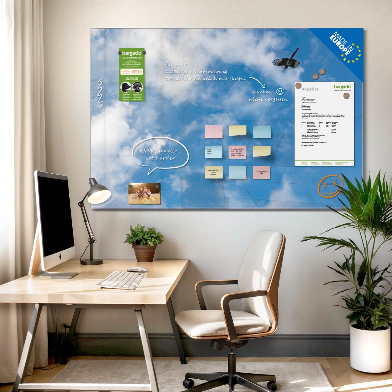 Jede Glas Magnettafel wird in unserer Werkstatt von Hand gefertigt und sorgfältig geprüft. So erhalten Sie ein echtes Qualitätsprodukt, das Funktion und Ästhetik perfekt vereint.?? Warum banjado?