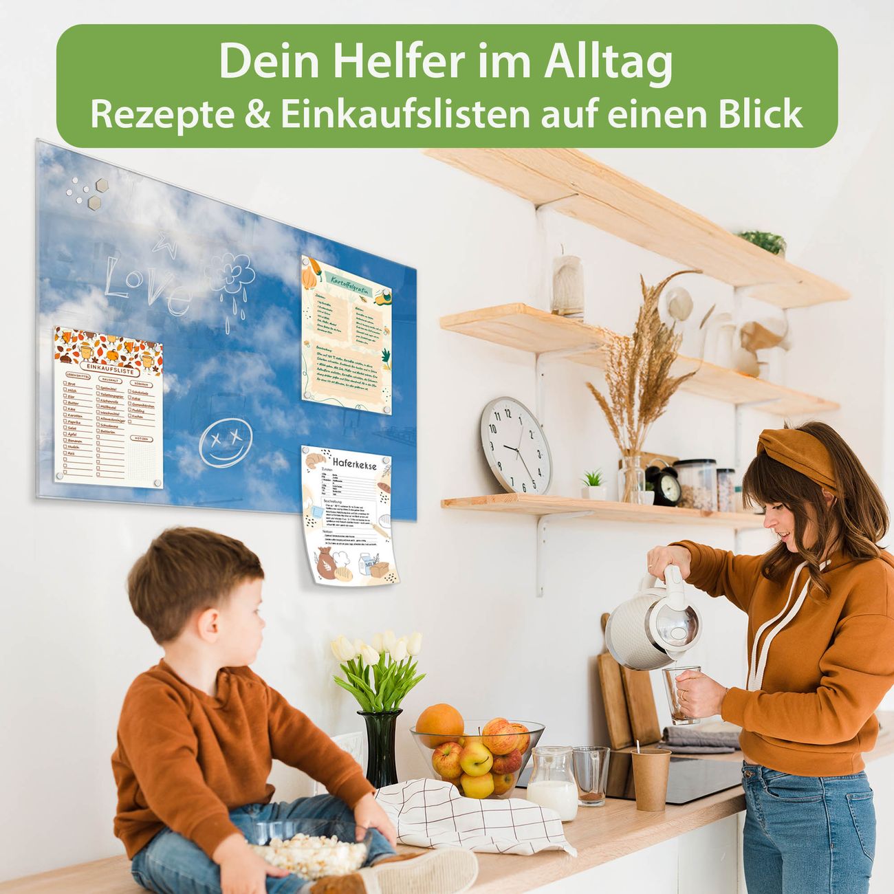 Auf der glatten Glasoberfläche lassen sich Termine, Rezepte oder Notizen ganz einfach mit Kreidestiften festhalten und rückstandslos entfernen. Starke Neodym-Magnete halten Ihre wichtigsten Erinnerungen sicher an Ort und Stelle. So entsteht Ihre ganz persönliche Ideenwand - jeden Tag neu.