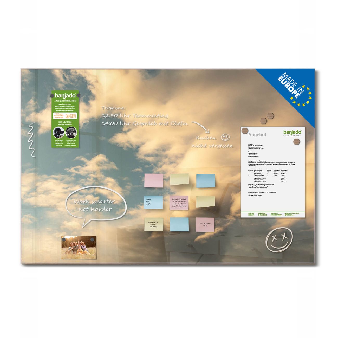 Jede Glas Magnettafel wird in unserer Werkstatt von Hand gefertigt und sorgfältig geprüft. So erhalten Sie ein echtes Qualitätsprodukt, das Funktion und Ästhetik perfekt vereint.?? Warum banjado?