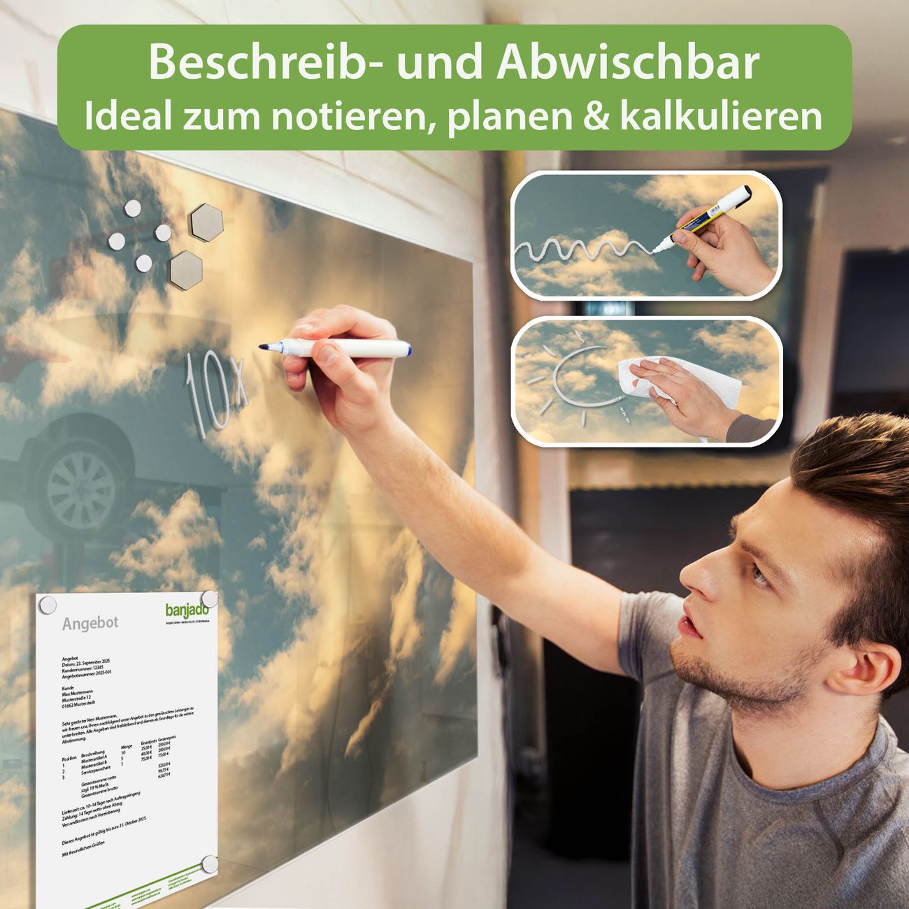 Jede Glas Magnettafel wird in unserer Werkstatt von Hand gefertigt und sorgfältig geprüft. So erhalten Sie ein echtes Qualitätsprodukt, das Funktion und Ästhetik perfekt vereint.?? Warum banjado?