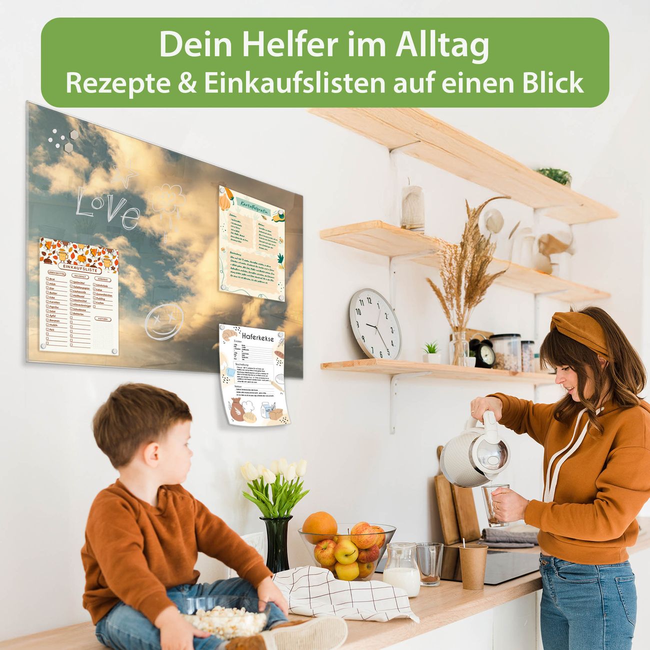 Auf der glatten Glasoberfläche lassen sich Termine, Rezepte oder Notizen ganz einfach mit Kreidestiften festhalten und rückstandslos entfernen. Starke Neodym-Magnete halten Ihre wichtigsten Erinnerungen sicher an Ort und Stelle. So entsteht Ihre ganz persönliche Ideenwand - jeden Tag neu.