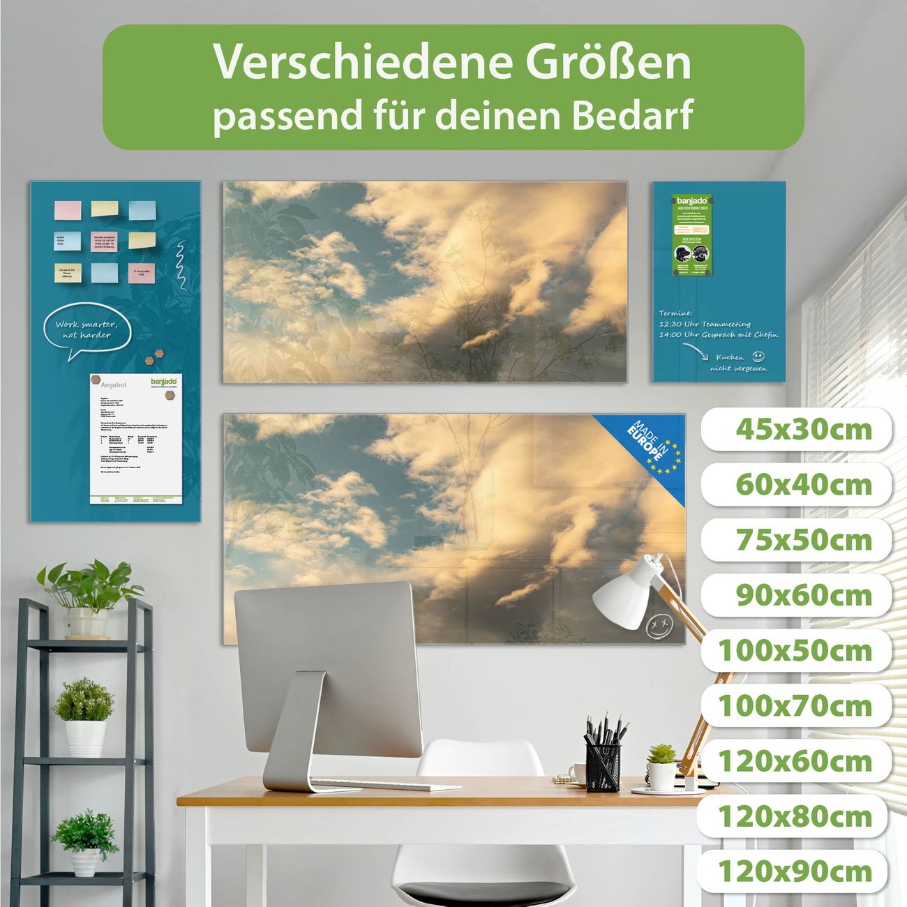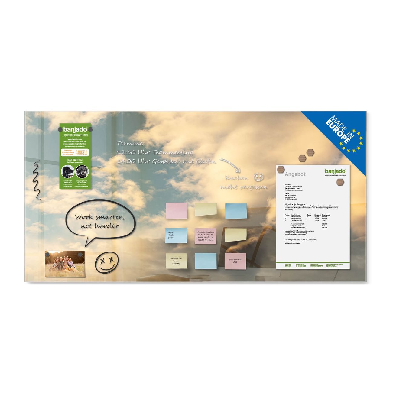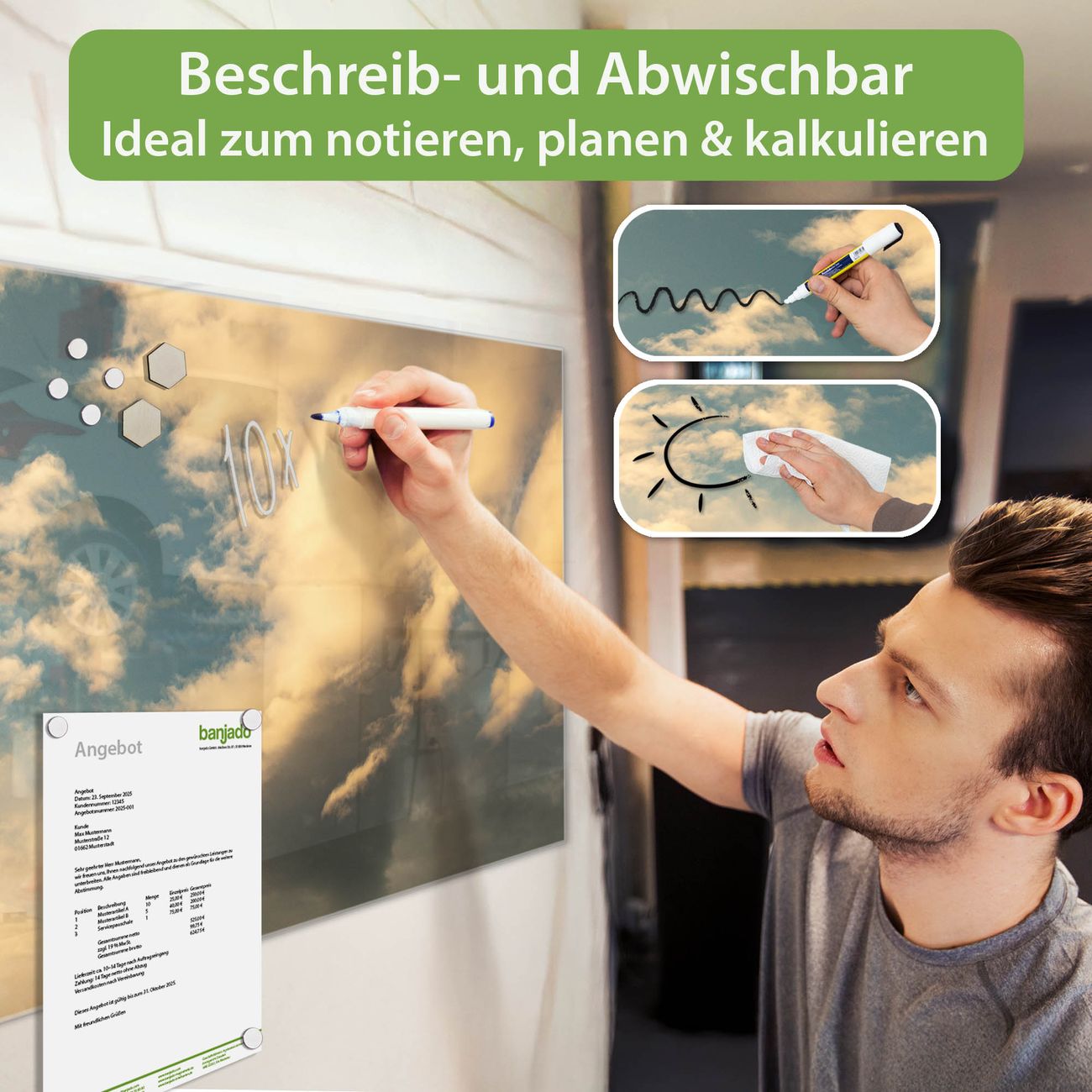 Jede Glas Magnettafel wird in unserer Werkstatt von Hand gefertigt und sorgfältig geprüft. So erhalten Sie ein echtes Qualitätsprodukt, das Funktion und Ästhetik perfekt vereint.?? Warum banjado?