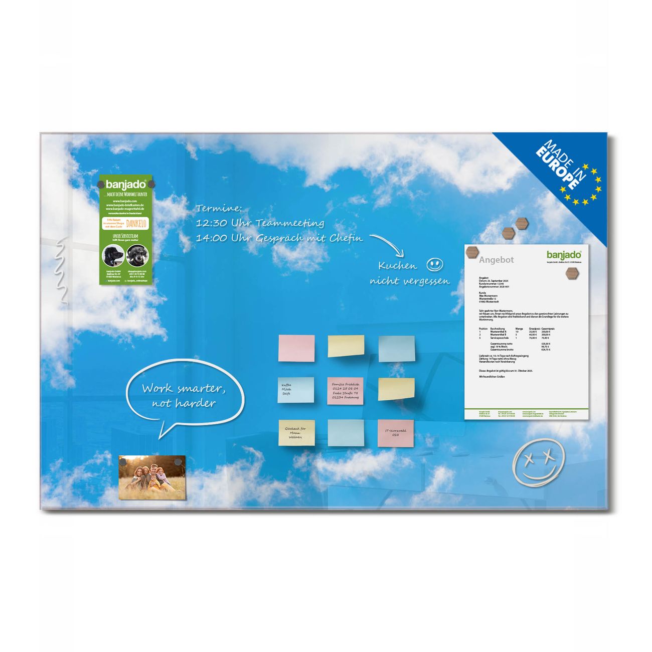 Jede Glas Magnettafel wird in unserer Werkstatt von Hand gefertigt und sorgfältig geprüft. So erhalten Sie ein echtes Qualitätsprodukt, das Funktion und Ästhetik perfekt vereint.?? Warum banjado?