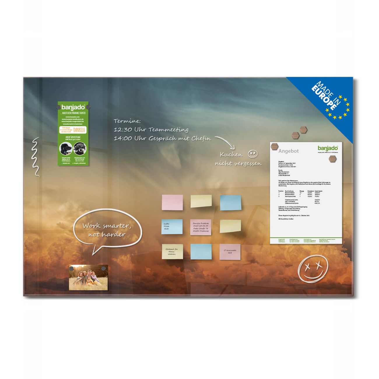 Jede Glas Magnettafel wird in unserer Werkstatt von Hand gefertigt und sorgfältig geprüft. So erhalten Sie ein echtes Qualitätsprodukt, das Funktion und Ästhetik perfekt vereint.?? Warum banjado?