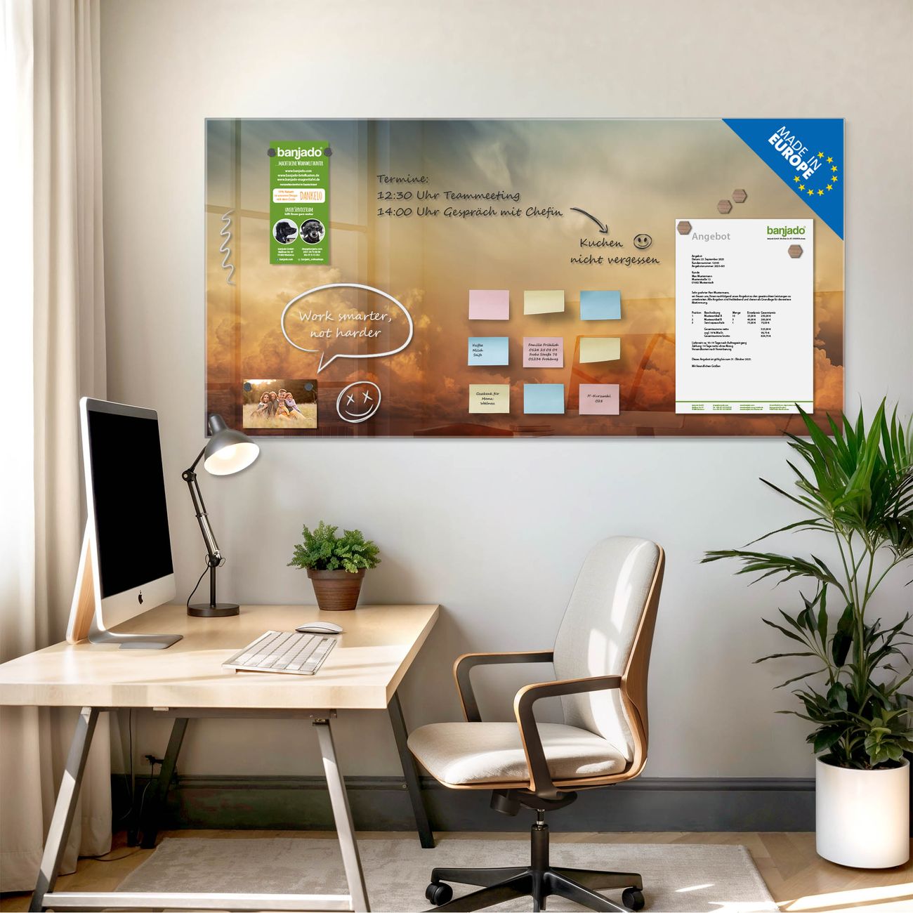 Jede Glas Magnettafel wird in unserer Werkstatt von Hand gefertigt und sorgfältig geprüft. So erhalten Sie ein echtes Qualitätsprodukt, das Funktion und Ästhetik perfekt vereint.?? Warum banjado?