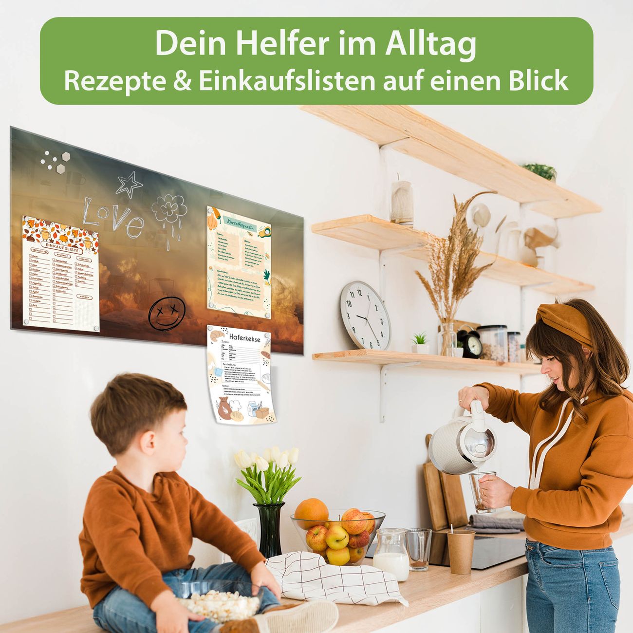 Auf der glatten Glasoberfläche lassen sich Termine, Rezepte oder Notizen ganz einfach mit Kreidestiften festhalten und rückstandslos entfernen. Starke Neodym-Magnete halten Ihre wichtigsten Erinnerungen sicher an Ort und Stelle. So entsteht Ihre ganz persönliche Ideenwand - jeden Tag neu.