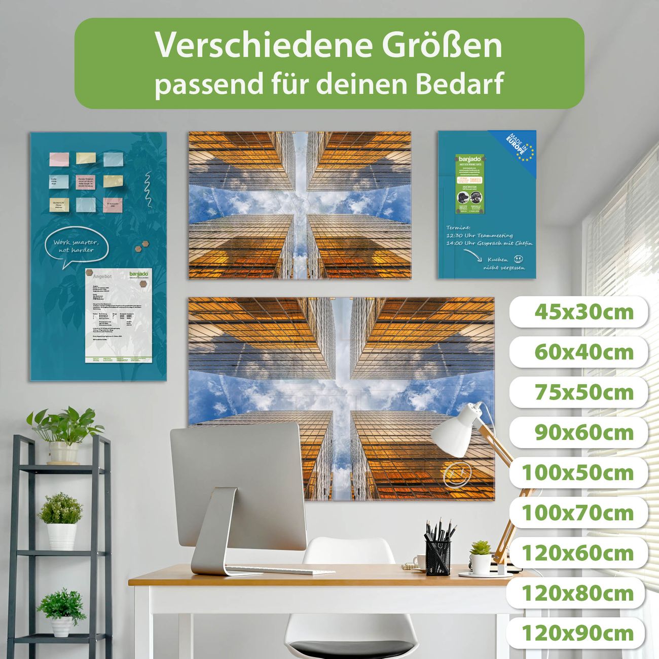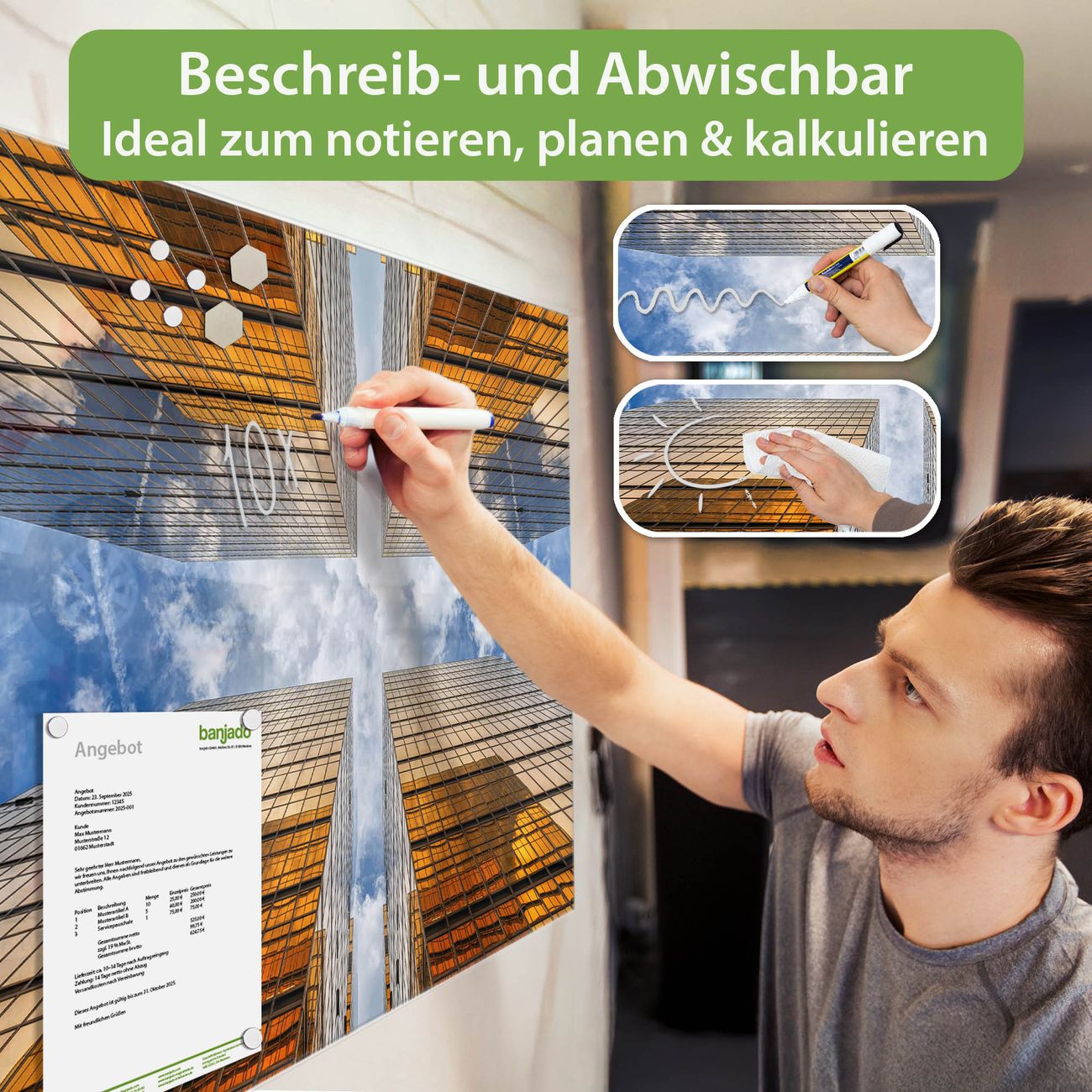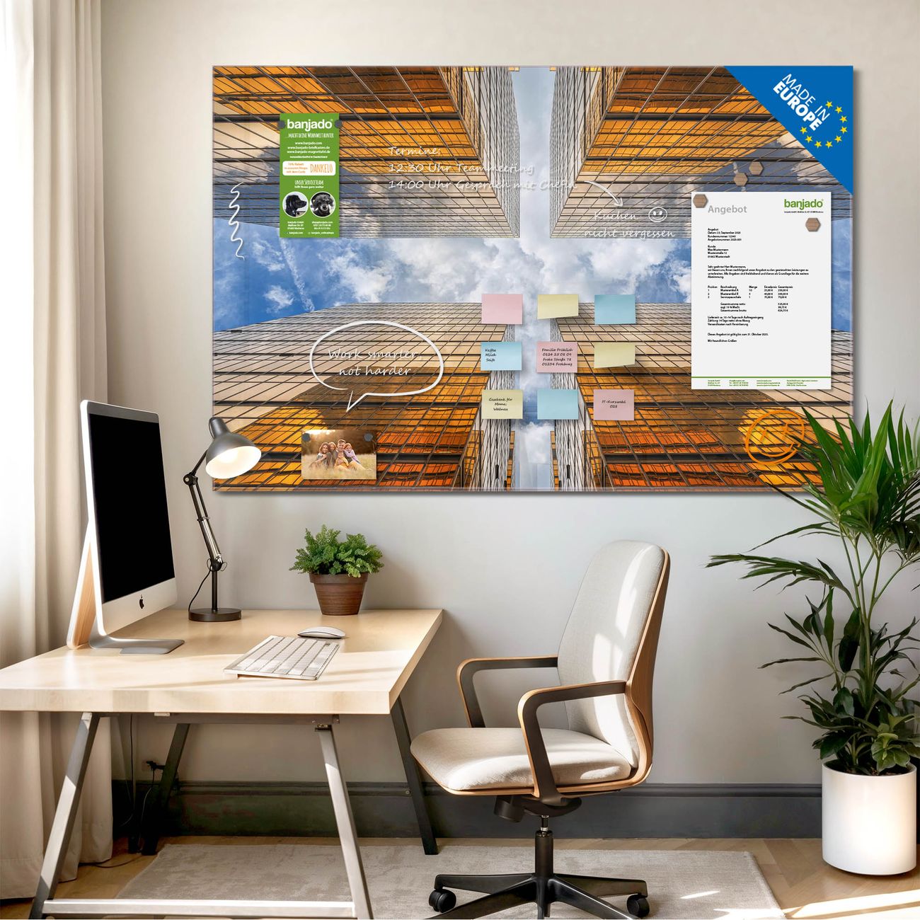 Jede Glas Magnettafel wird in unserer Werkstatt von Hand gefertigt und sorgfältig geprüft. So erhalten Sie ein echtes Qualitätsprodukt, das Funktion und Ästhetik perfekt vereint.?? Warum banjado?