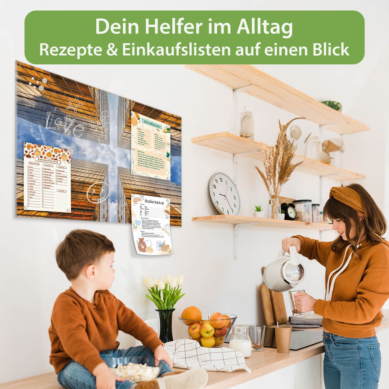 Auf der glatten Glasoberfläche lassen sich Termine, Rezepte oder Notizen ganz einfach mit Kreidestiften festhalten und rückstandslos entfernen. Starke Neodym-Magnete halten Ihre wichtigsten Erinnerungen sicher an Ort und Stelle. So entsteht Ihre ganz persönliche Ideenwand - jeden Tag neu.