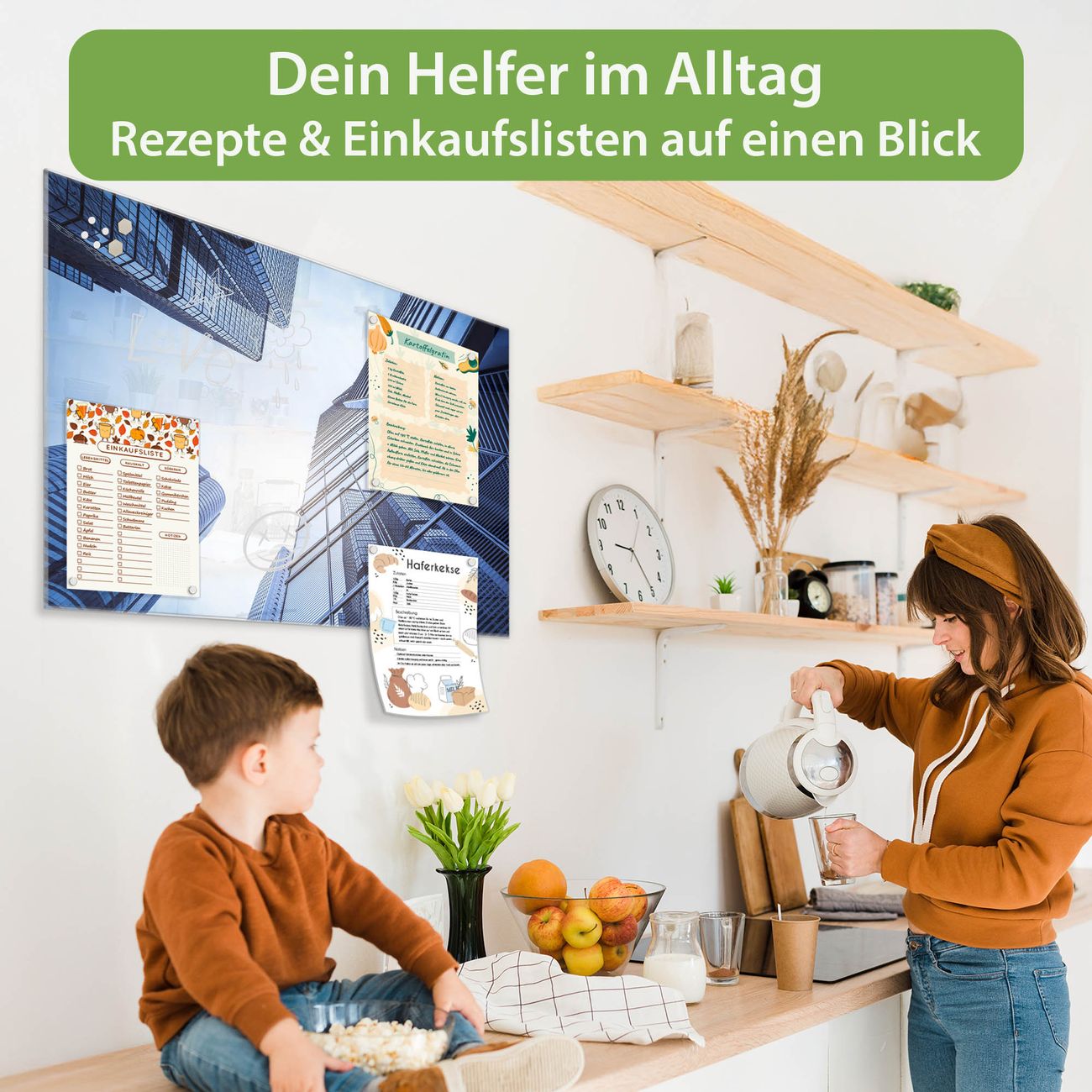 Ein Stück Design, das Ihren Alltag organisiert. Schreiben, heften, inspirieren - alles an einem Ort. Qualität, die man spürt. Montage leicht gemacht. Handwerk mit Herz - veredelt in Sachsen. Einzigartiges Design mit Motiv Motiv Wolkenkratzer Beschreibbare Glasoberfläche, leicht zu reinigen Starke Magnetkraft durch Stahlrückwand Inklusive 4 Neodym-Magneten Flexible Montageoptionen Handveredelt in Sachsen - Qualität, die bleibt