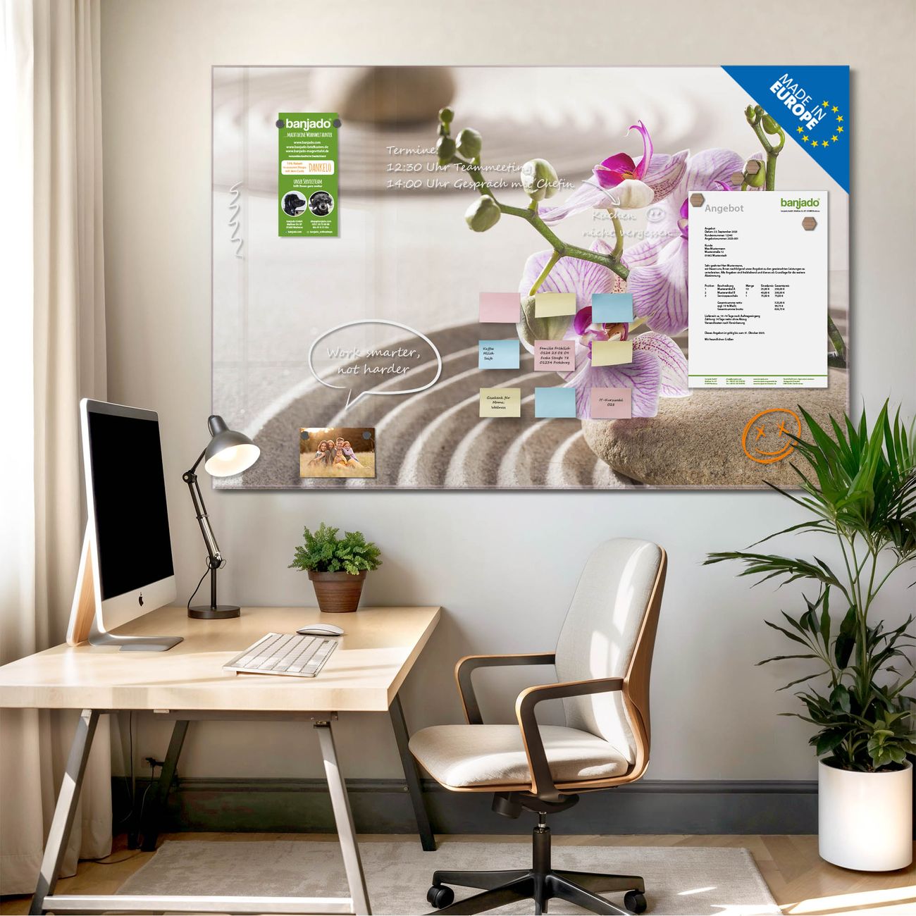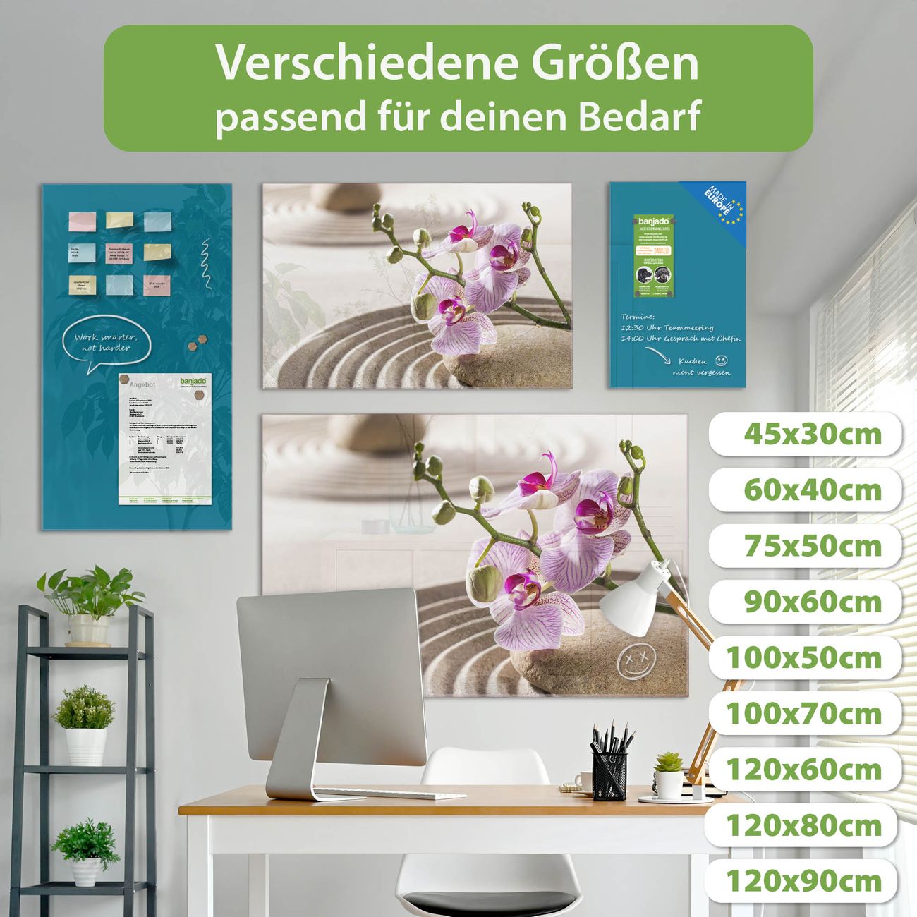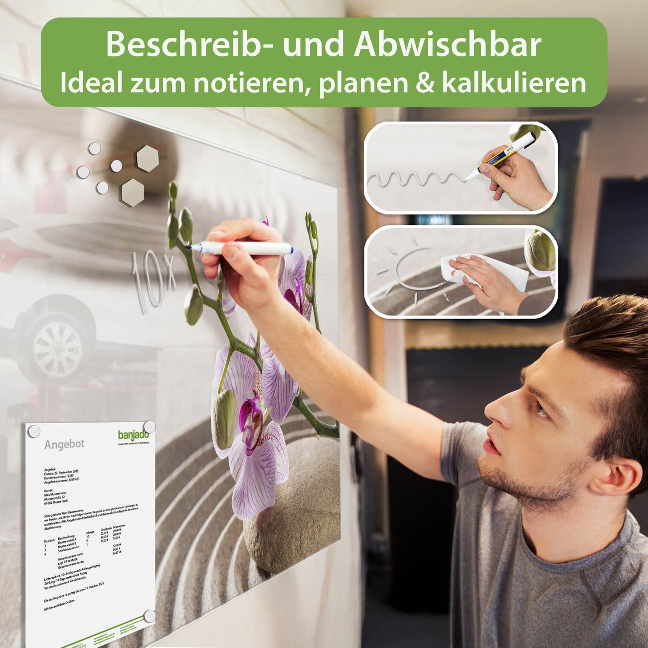 Jede Glas Magnettafel wird in unserer Werkstatt von Hand gefertigt und sorgfältig geprüft. So erhalten Sie ein echtes Qualitätsprodukt, das Funktion und Ästhetik perfekt vereint.?? Warum banjado?